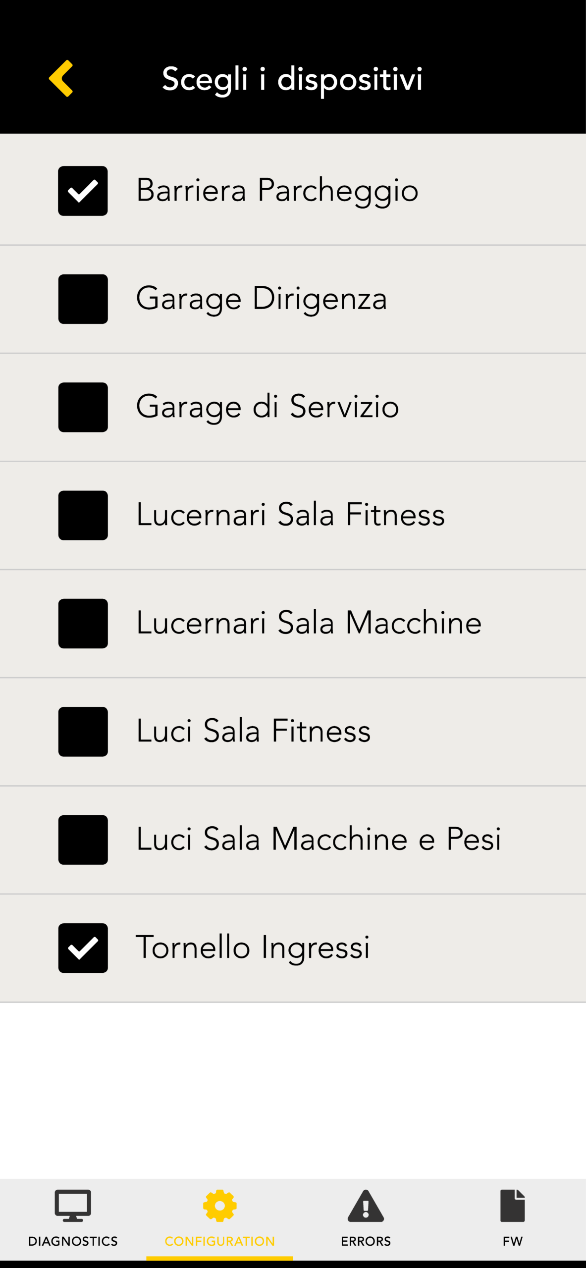 Questa funzionalità consente di aggiungere alla lista dei singoli dispositivi un gruppo che ne comprenda uno o più. In questo modo è possibile, con un’unica azione, realizzare il comando contemporaneo dei vari dispositivi. Inoltre, il tipo di comando può essere diverso per ciascun dispositivo all’interno del medesimo scenario. Infine, ogni scenario può essere oggetto di tutte le funzioni di programmazione avanzata come gli Eventi programmati, le Fasce orarie di accesso, le abilitazioni temporanee, i widget o il comando tramite posizione GPS.