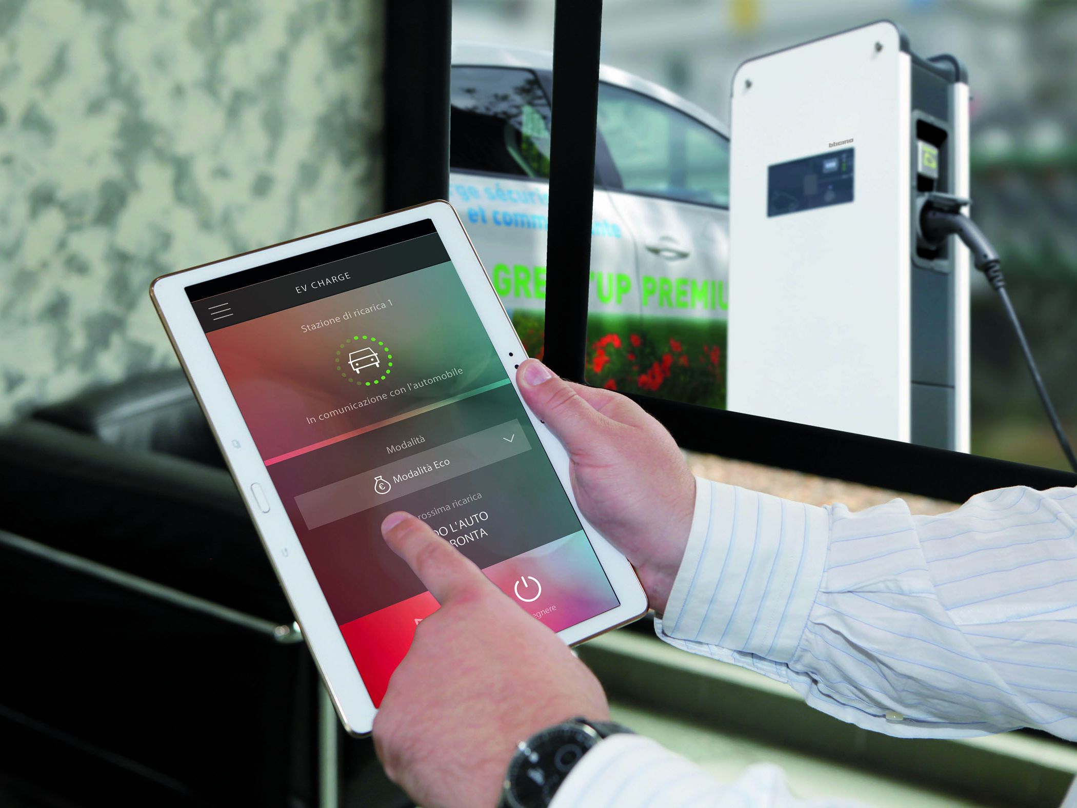 La ricarica è gestibile in locale con Bluetooth in dotazione e applicazione EV Charge, o in remoto da dispositivi mobili, da rete IP o Wi-Fi con il kit opzionale di comunicazione.