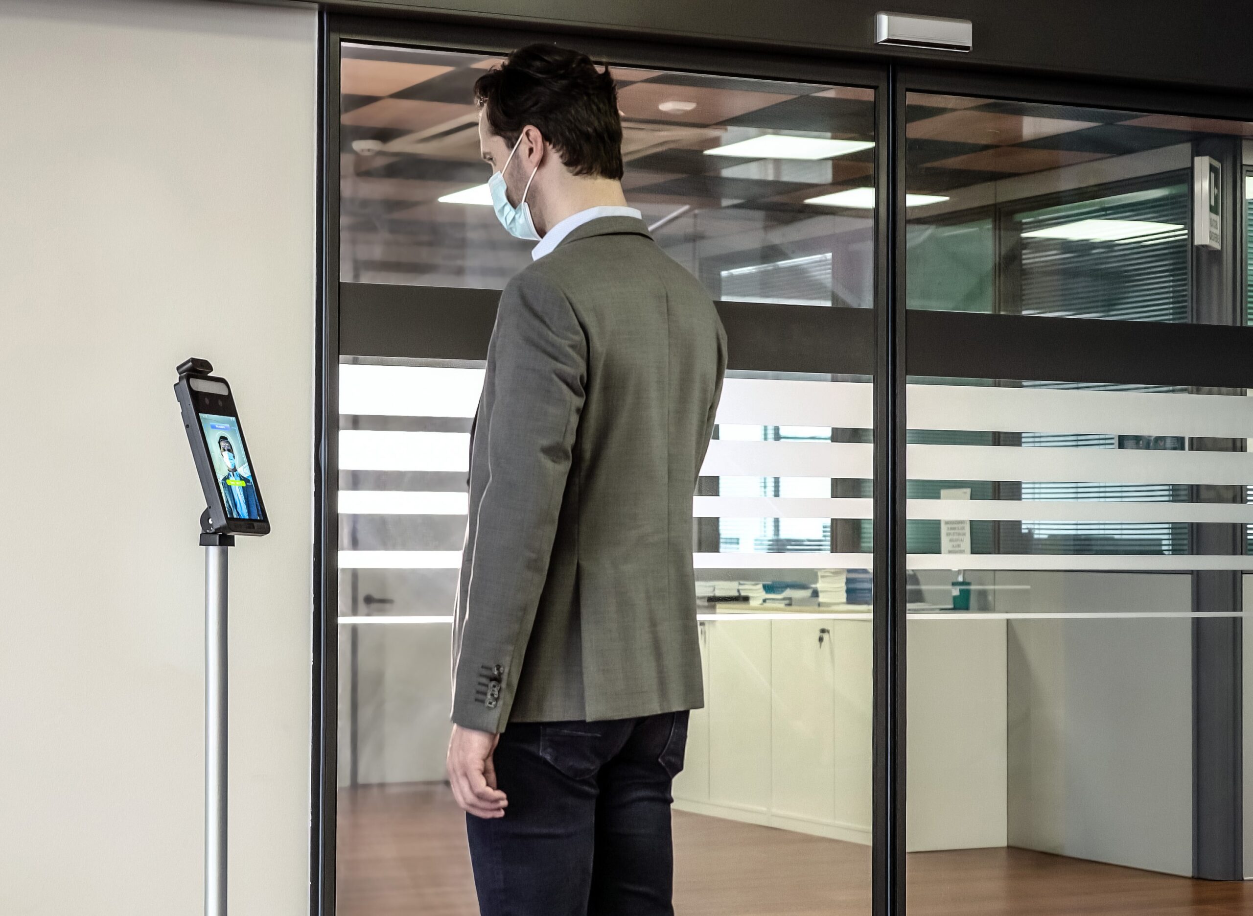 termoscannerQuando ci si presenta davanti all’ingresso automatico, grazie alle istruzioni date dalla guida vocale, viene eseguito una scansione del volto che rileva, senza bisogno alcun contatto fisico e senza l’ausilio di personale preposto, se la temperatura corporea è al di sotto dei 37,5° e se la persona indossa correttamente la mascherina. Solo nel caso in cui entrambi i requisiti di legge siano rispettati l’ingresso viene consentito tramite un segnale luminoso e vocale.