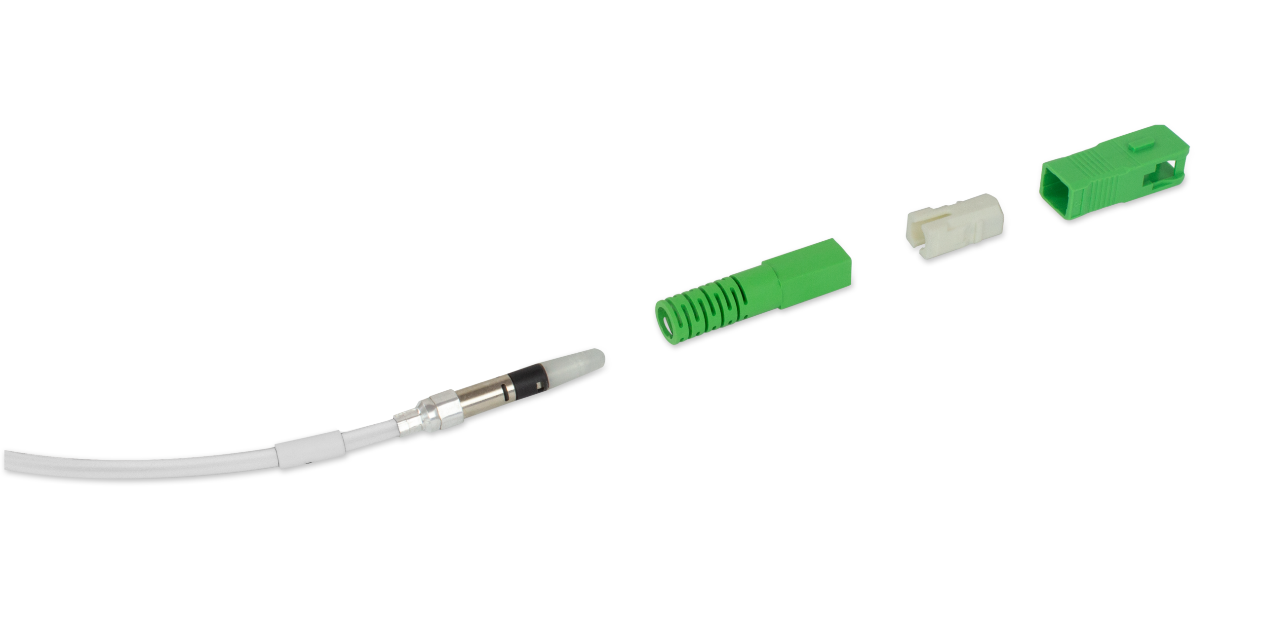 La terminazione con connettore SC/APC smontato e protetta da una calza di tiraggio permette il passaggio all’interno di tubature di piccole dimensioni, anche in presenza di altri cavi. A posa ultimata, basta rimuovere la calza e completare l’assemblaggio del connettore senza ricorrere a sistemi di giunzione a fusione o meccanica.