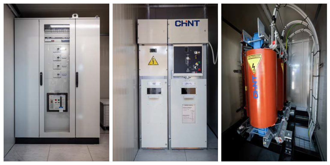 Da sinistra verso destra: QUADRO di bassa tensione con un quadro di protezione di parallelo; QUADRO di media tensione con una cella di media tensione; TRASFORMATORE di media e bassa tensione