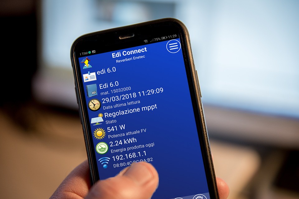 Reverberi Enetec (Croce, RE) ha avviato un percorso di ricerca e produzione anche nel settore del risparmio energetico nel mondo fotovoltaico: sugli inverter della gamma EDI, a richiesta, è disponibile il collegamento Wi-Fi con apposita APP che consente di visualizzare i parametri dell’inverter, di configurare la modalità di funzionamento del relè presente a bordo (ad esempio, per attivare una pompa di calore al superamento di una soglia di potenza prodotta impostabile), di effettuare il test di interfaccia e di inviarlo via e-mail.