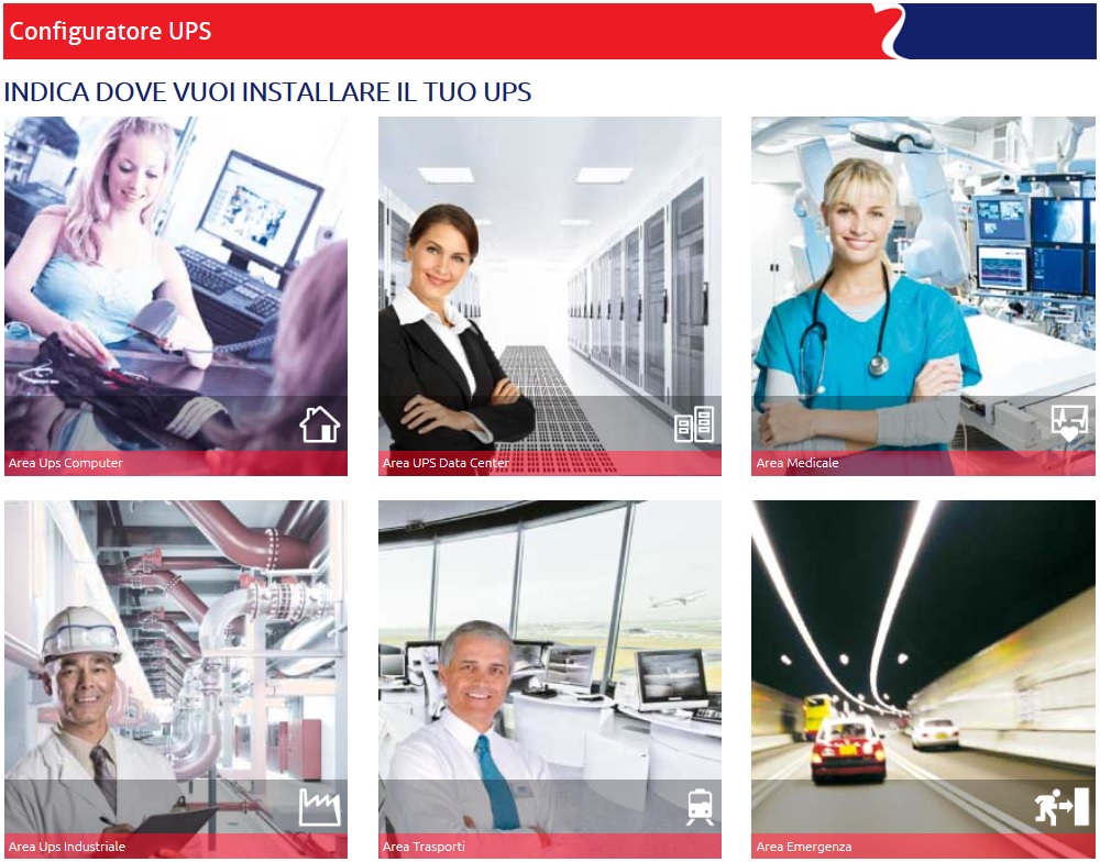toolrielloupsRiello UPS ha messo a punto un nuovo tool che permette di ottenere con pochi e semplici passi la miglior configurazione di UPS specifica per le esigenze dell’utente. Il sistema di configurazione consente di definire l’area di riferimento dell’applicazione (Soho, Data Centre, E-Medical, Industry, Trasport, Emergency) per poter poi selezionare gli UPS più adatti alla tipologia di utilizzo.