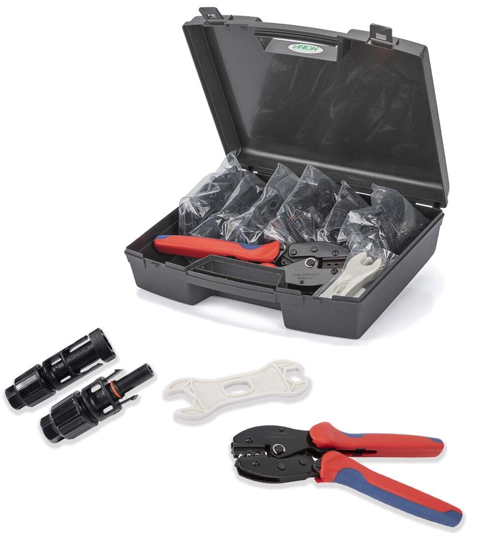 La gamma è disponibile nella completa e funzionale valigetta kit fotovoltaico, contenente 30 connettori maschio mobili, 30 connettori femmina mobili, una pinza crimpatrice e una coppia di chiavi di assemblaggio. Innovazione pronta all’uso per installazioni fotovoltaiche.