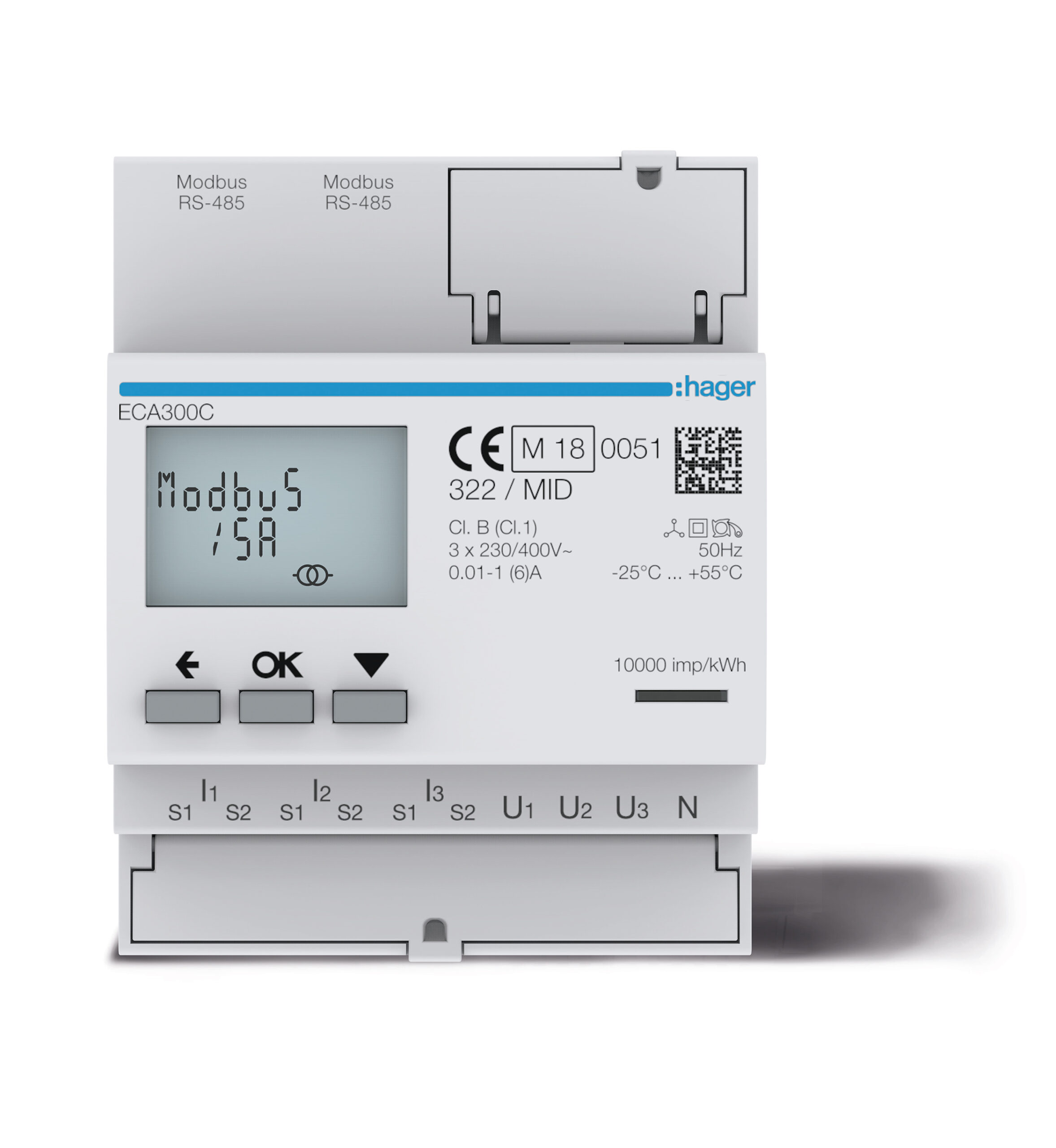 Solo la nuova gamma di contatori Hager Bocchiotti è disponibile in misura diretta fino a 125A trifase con l’assegnazione di un solo indirizzo bus anziché tre come per il contatore 3x80A monofase. Il contatore sui quattro quadranti consente la visualizzazione di potenza attiva (kW), reattiva (kvarh), apparente (kVA), tensione (V), corrente (A), fattore di potenza e frequenza (Hz).