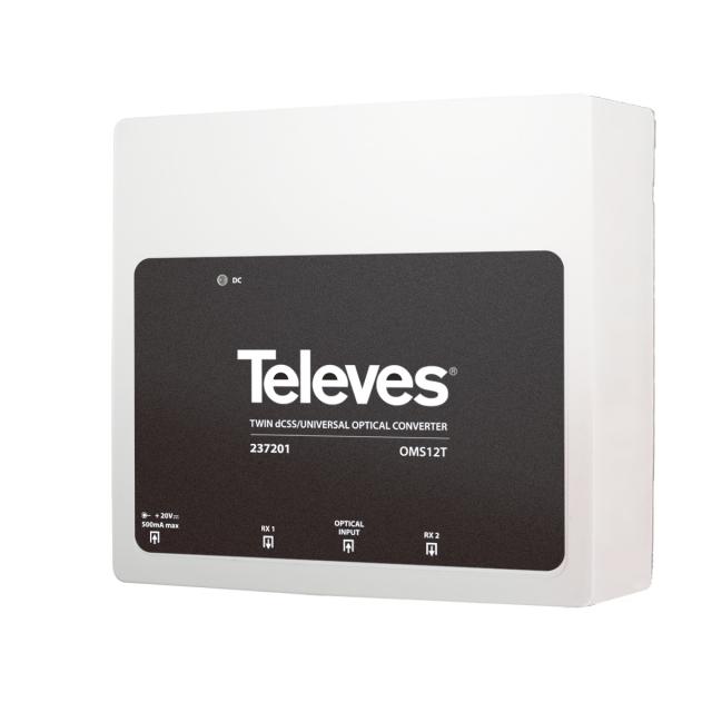 Il convertitore ottico dCSS Twin, presentato da Televes (Bettola-Zeloforamagno, MI), riceve un segnale ottico in ingresso e rigenera il segnale RF originale, fornendo in uscita il segnale della banda terrestre e le bande delle quattro polarità del satellite. Il convertitore ottico può lavorare nelle modalità Legacy, SCR I (EN50494), SRC II (EN50607) e SKY SCR.