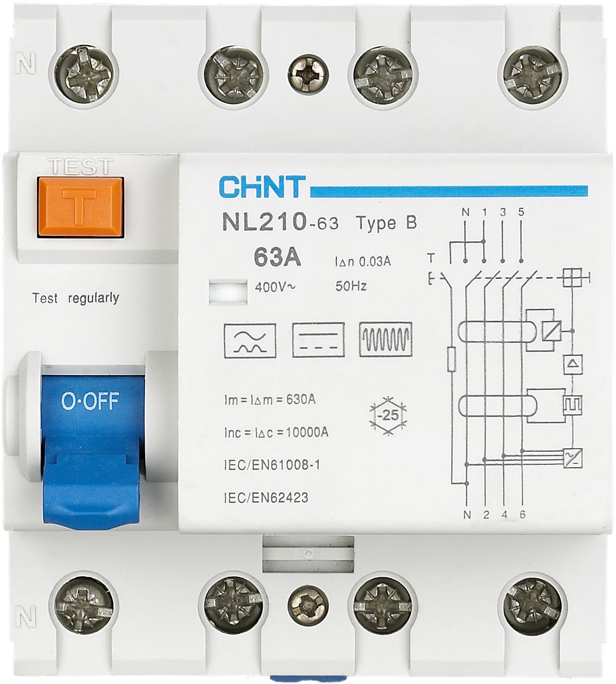 – NL210 4P Interruttore differenziale puro quattro tetrapolare da 63A, Inc da 10 kA ed Idn da 30 mA in classe B.
