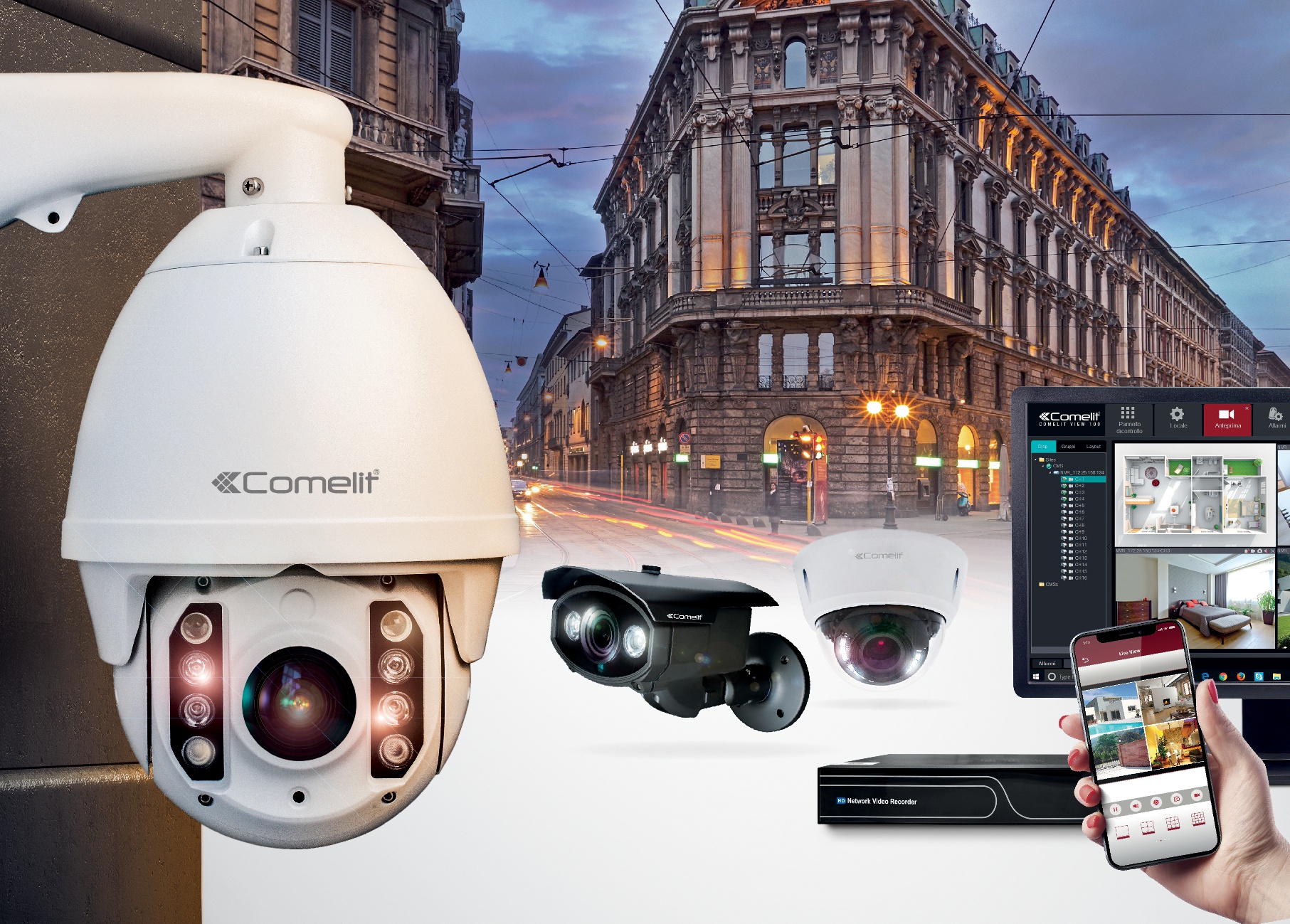 Completano la gamma le nuove telecamere, disponibili in versione Bullet, Dome, PTZ e Vandaldome. Il sistema potrà essere gestito da remoto utilizzando l’app “Comelit View 100” e il relativo software di gestione, proprio come per la serie IP 100.