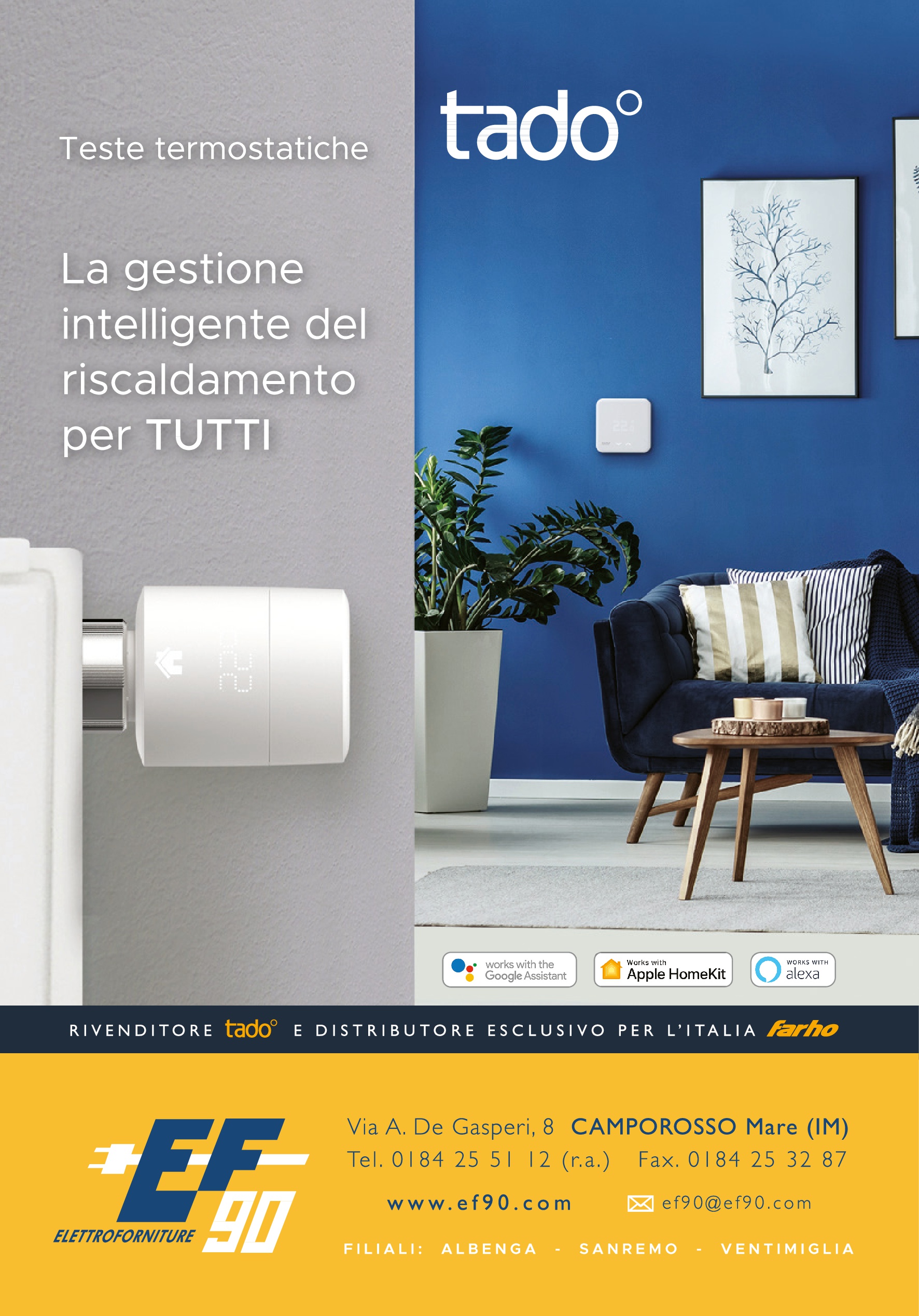Dalla Germania è distribuito da ormai quattro anni in Italia il marchio tedesco Tado, azienda di Monaco di Baviera, conosciuta in tutta Europa per soluzioni intelligenti di gestione del riscaldamento. Il sistema dipende da un bridge, che permette di gestire da remoto l’impianto sia in caso di impianto indipendente, con utilizzo del Tado termostato sia per impianto centralizzato con le sole tado testine. Attraverso il wifi di casa, e la compatibilità con Amazon Alexa, Apple Homekit e Google assistant, il sistema permette la gestione, programmazione e utilizzo di ogni singolo radiatore da remoto, in un’ottica di risparmio certo. La proposta Tado si completa infine con il Tado Ac control, dispositivo ad infrarossi che permette il controllo e la gestione da remoto di qualsiasi unità interna di aria condizionata. Ef 90 (Camporosso, IM), azienda ligure di ingrosso materiale elettrico, ha portato avanti una collaborazione diretta per far conoscere la soluzione nel mondo professionale e distributivo, garantendo spedizione immediata in tutta Italia e disponibilità costanti a magazzino.