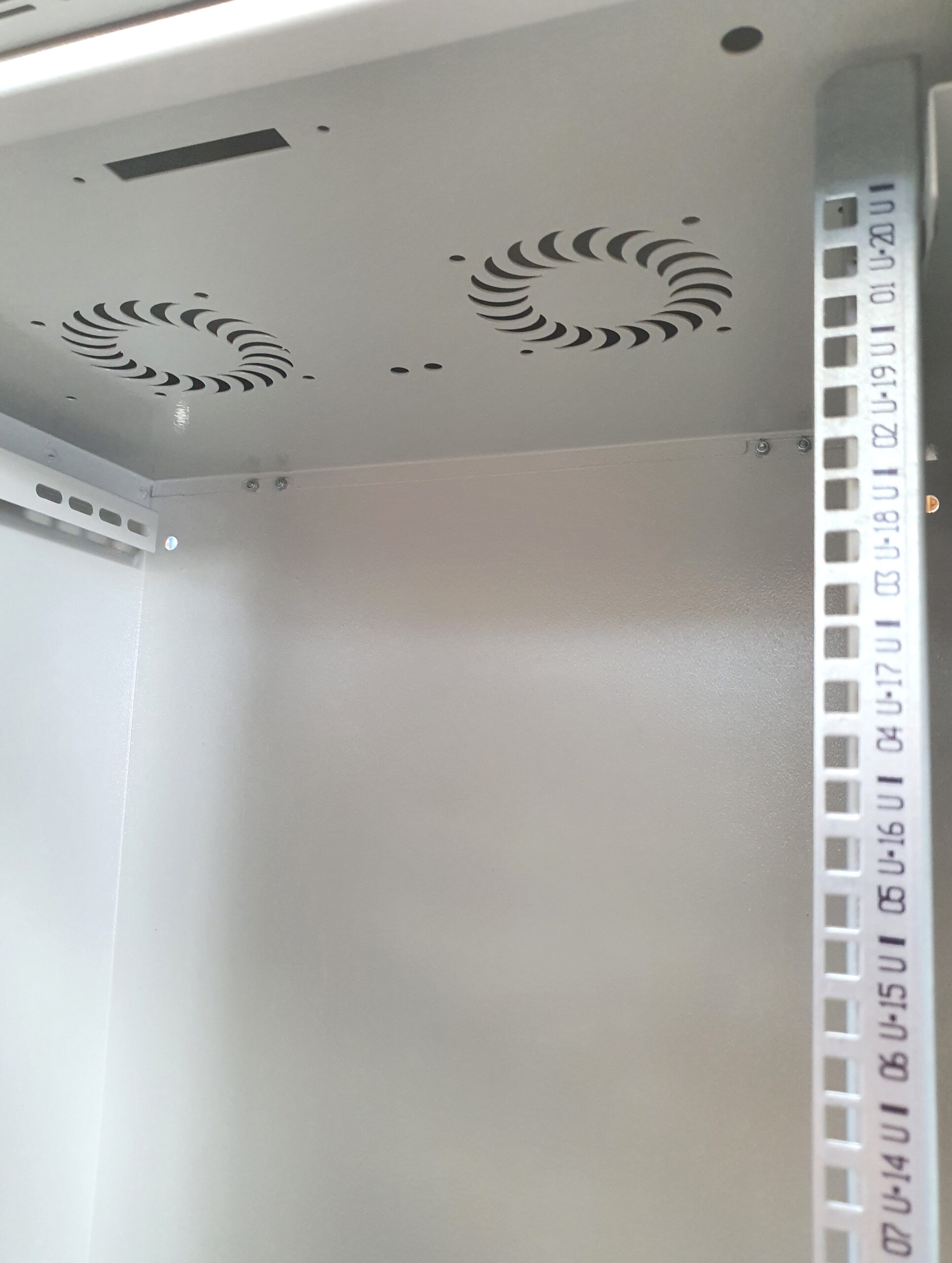 La porta frontale in lamiera è dotata di un sistema di chiusura a chiave, mentre i resistenti pannelli laterali sono ciechi e non asportabili. Sul tetto è previsto un coperchio con feritoie, facilmente apribile per l’ispezione delle ventole.
