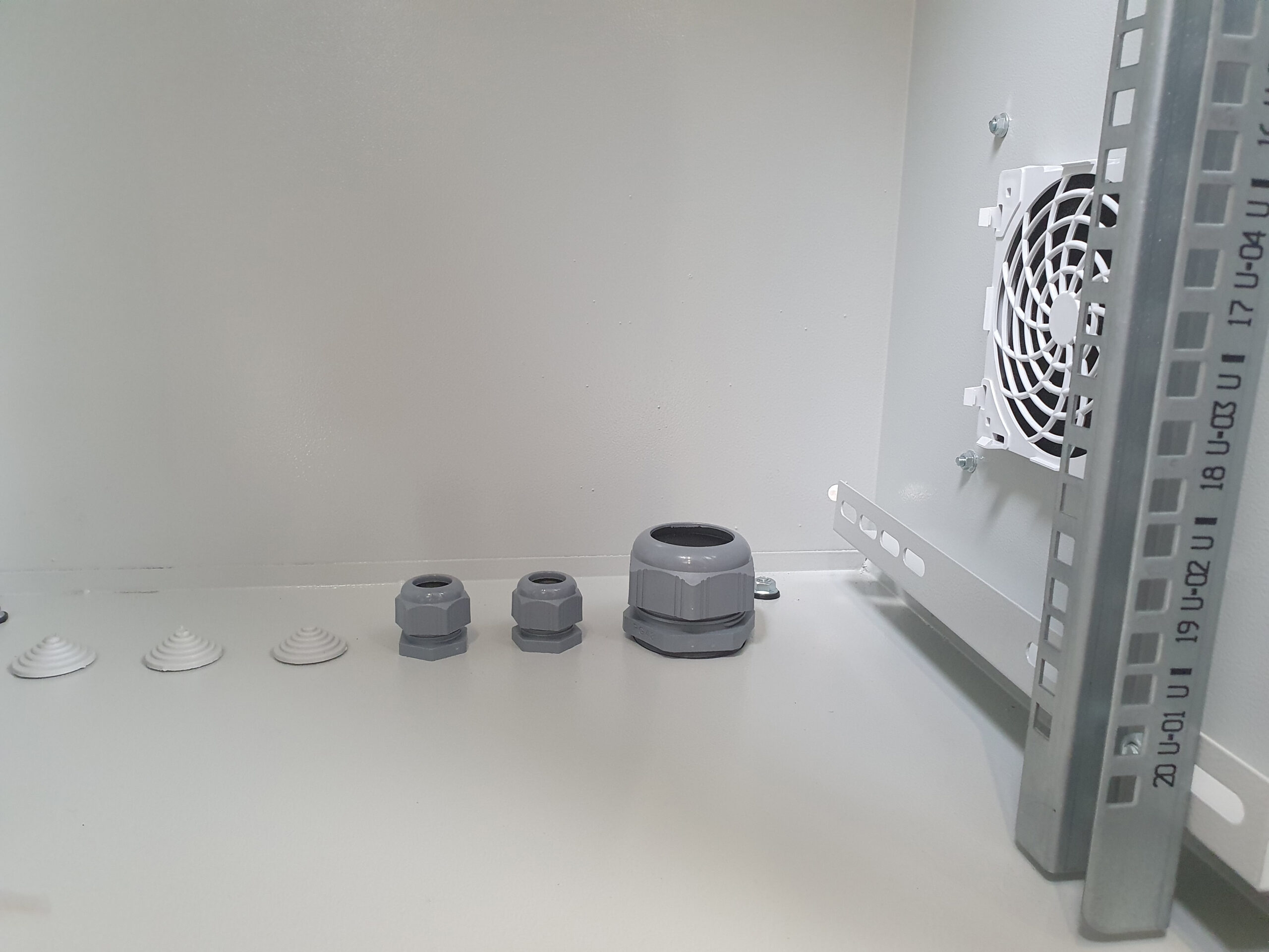 L’armadio è inoltre predisposto per l’installazione sia di ventole a soffitto sia di due ventole laterali protette da un sistema di filtri già installato. Il fondo è predisposto per l’ingresso dei cavi: nella parte inferiore dell’armadio si trovano un pressacavo passo PG48, due pressacavi PG21 e tre flange cieche in PVC da 28 mm di diametro che consentono di proteggere e gestire un consistente ingresso di cavi.