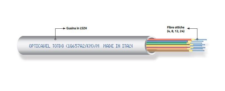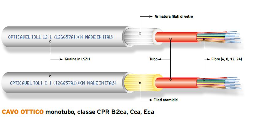 I cavi monotubo, classe CPR B2ca, di tipo loose, con armatura a filati di vetro, sono adatti per la posa interna e a essere utilizzati per collegare l’armadio dell’operatore telefonico al suo ROE, situato nel locale tecnico dell’edificio da cablare;