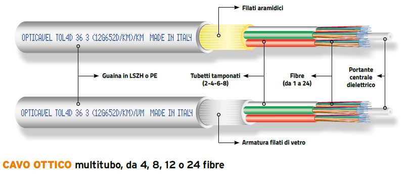 5. I cavi multitubo con struttura a tubetti tamponati fino a 24 fibre, di tipo loose, armati e non armati, sono da interramento oppure da interno, con potenzialità fino a 288 fibre.