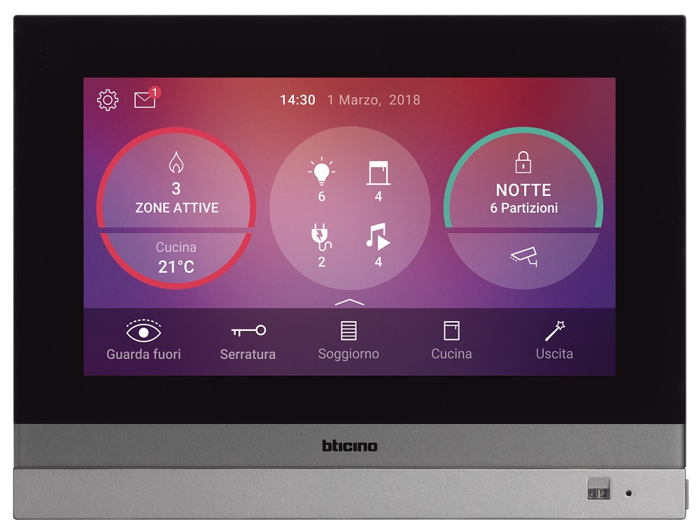 BTicino (Varese) presenta Hometouch, un display capacitivo da 7” multifunzione, che non richiede alcuna configurazione e può essere personalizzato dall’utente. Alla supervisione del sistema domotico MyHome_Up, Hometouch abbina anche la funzione di posto interno videocitofonico connesso, gestibile in locale o a distanza grazie all’applicazione per smartphone. Infatti, oltre alla supervisione del sistema domotico, Hometouch è anche un posto interno videocitofonico connesso che permette di visualizzare le chiamate ricevute dalla pulsantiera esterna sul suo display 7” o su smartphone, grazie all’app dedicata scaricabile gratuitamente da App Store o da Google Play. L’estetica elegante e tecnologica, il design minimal e i dettagli metallizzati, ne permettono l’installazione in qualsiasi contesto abitativo o lavorativo.