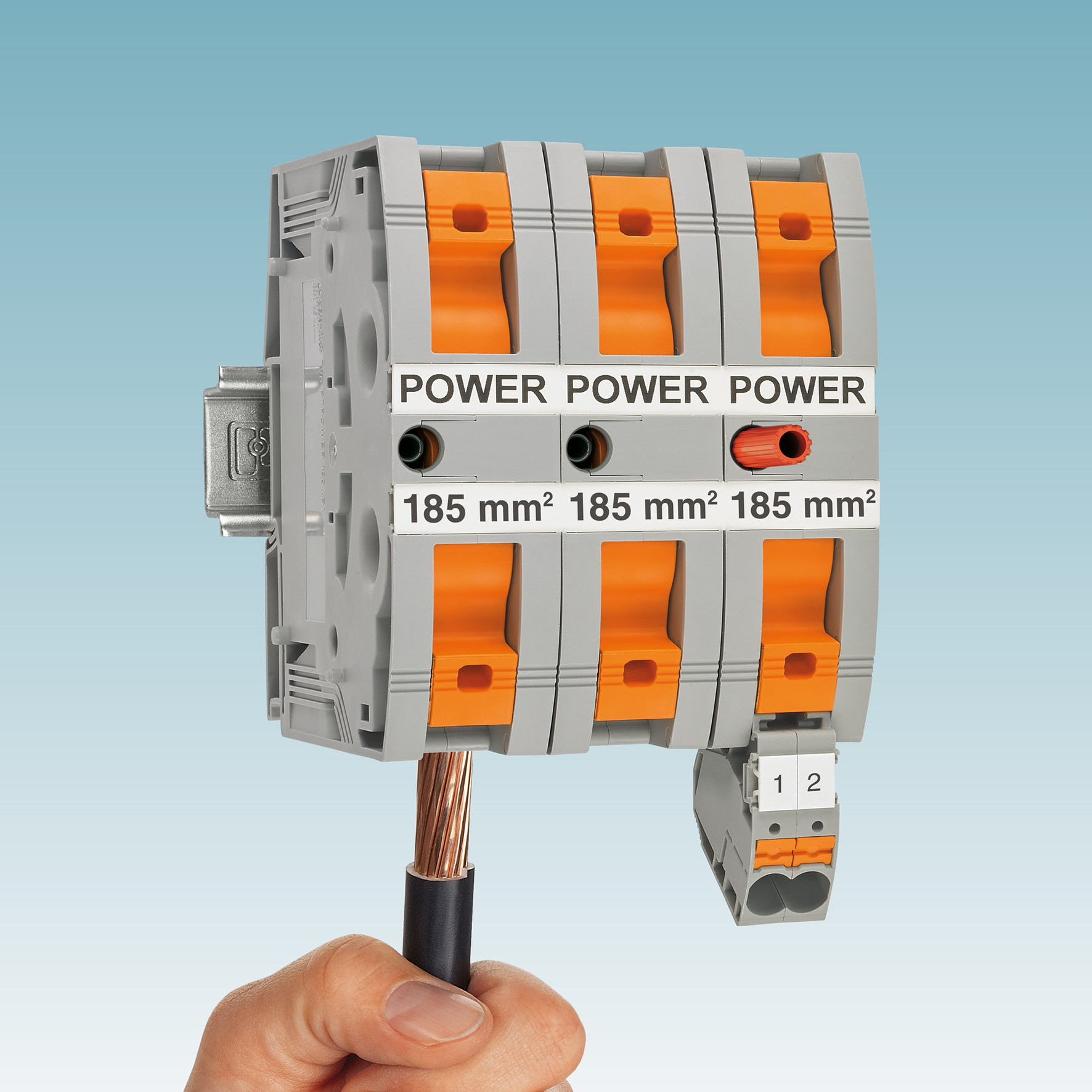 Con i morsetti PT Power 185 di Phoenix Contact (Cusano Milanino, MI), le sezioni di conduttori fino a 185 mm² possono essere cablate in modo rapido e facile: la tecnica di connessione a molla brevettata Power-Turn consente di collegare i conduttori di grandi dimensioni in modo semplice e sicuro con un cacciavite standard ed un unico movimento della leva.