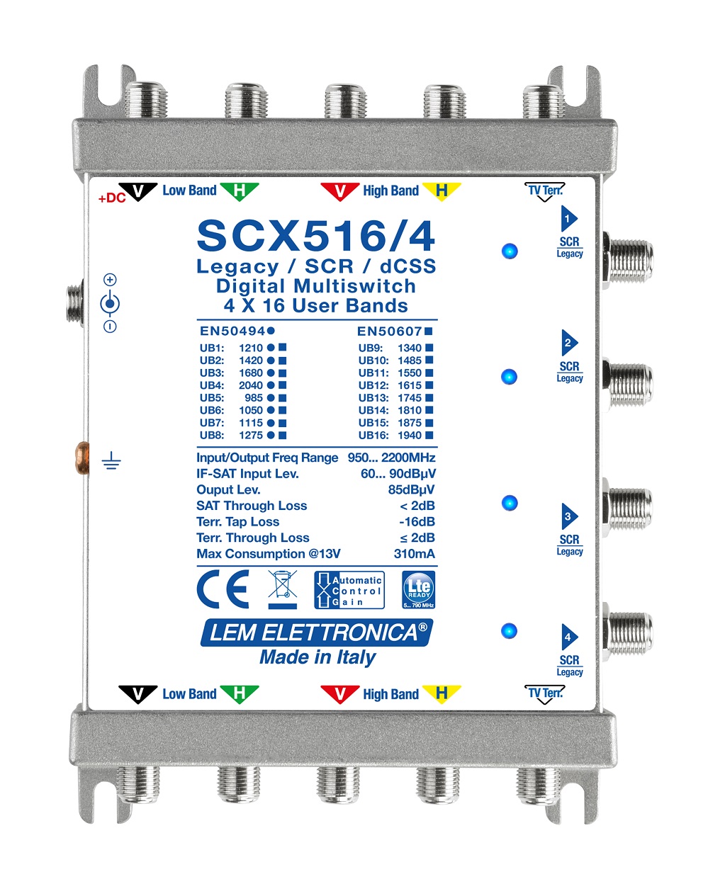 Sono dotati di miscelazione passiva dei segnali DTT e riconoscono automaticamente se i decoder ad esso collegati sono di tipo Legacy, SCR o dCSS opportunamente segnalato dal Led con funzione stato/diagnostica.