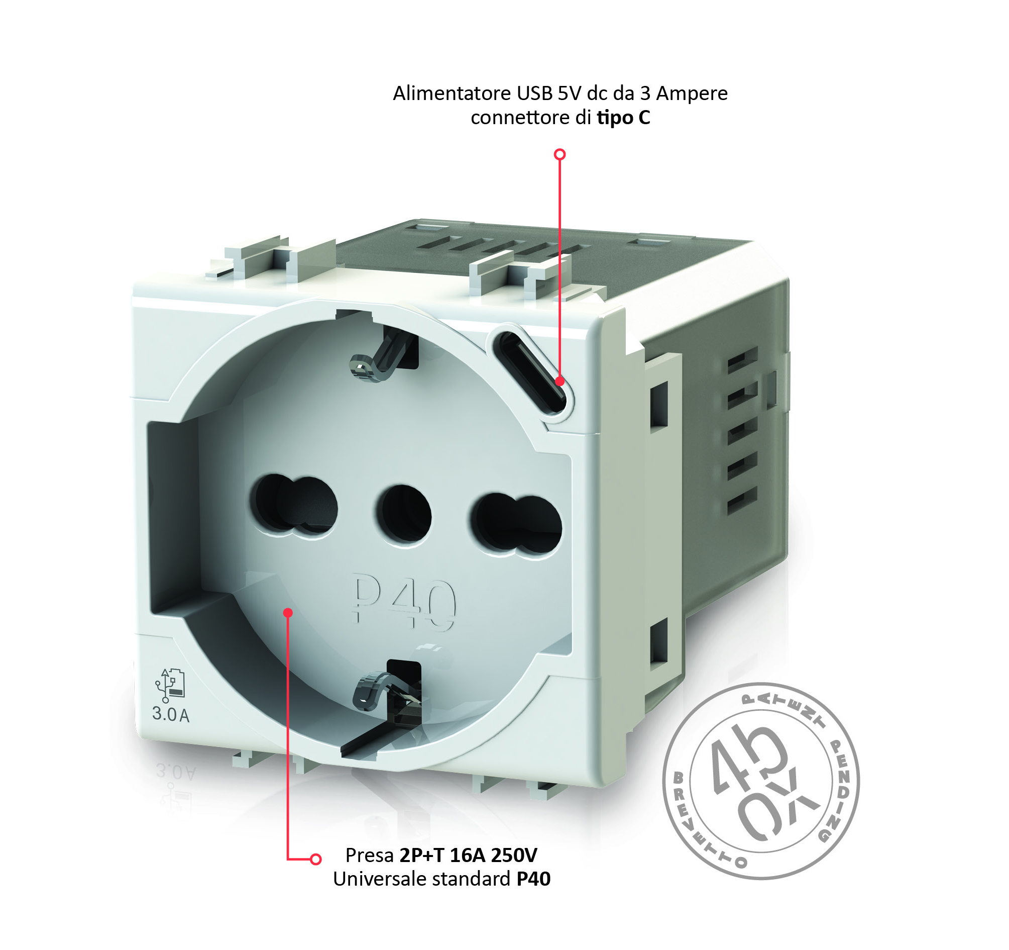 Nel resto del mondo esistono già soluzioni che integrano l’alimentatore USB e la presa elettrica, ma la tipologia di scatola da incasso utilizzata in Italia non ne permette l’installazione e l’utilizzo. Inoltre, queste soluzioni non dispongono delle tipologie di prese maggiormente utilizzate nel nostro Paese. Con P40 USB3.0 abbiamo risolto alla radice il problema, facendo “convivere” in due soli moduli una presa multifunzione e un alimentatore USB con connettore di Tipo C, garantendone la contemporaneità di utilizzo. Questa è una soluzione davvero unica nel suo genere».