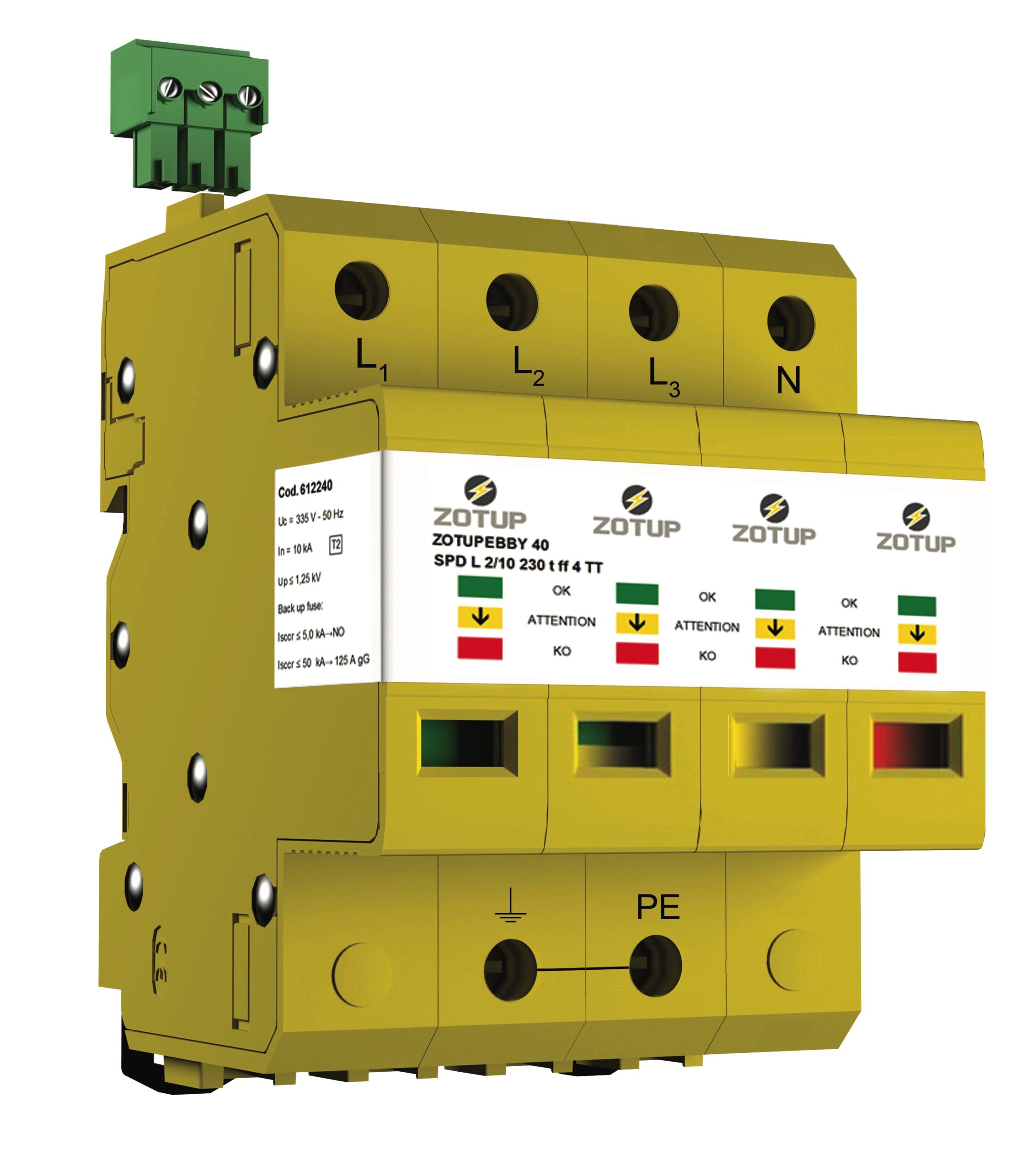 ZOTUPEBBY, inoltre, è immune alle cosiddette Sovratensioni Temporanee, comunemente identificate con l’acronimo TOV (dall’inglese Temporary Over Voltage), ossia transitori non di natura impulsiva che tendono a conservarsi per un periodo di tempo relativamente lungo e a 50 Hz. L’SPD, infatti, tiene le TOV in Modalità Tenuta e quindi ne è totalmente immune. Inoltre, grazie anche alla Funzione Fusibile Integrata (ff) che garantisce in occasione dell’eventuale fine vita dello scaricatore la modalità di guasto a circuito aperto, non necessita dell’adozione di fusibili di back-up posti in serie.