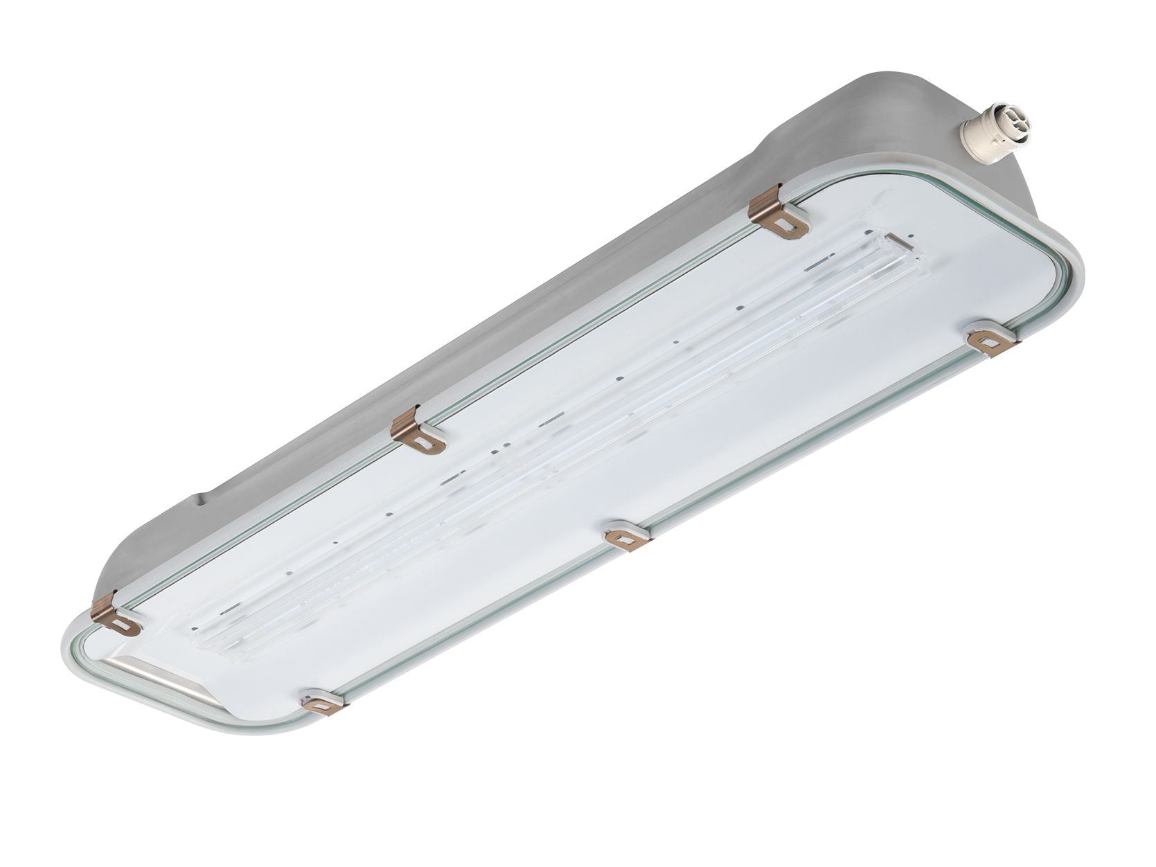 Il grado IP66 è garantito da una guarnizione rinforzata in elastomero anti invecchiante. La plafoniera è equipaggiata di golfari in acciaio INOX AISI 304 con filettatura M8 che si avvitano alla scocca, senza aprire l’apparecchio. Essi permettono l’aggancio a catena, funi e su blindoluce. I cablaggi sono realizzati con cavi per alte temperature con sezione da 9 a 12 mm2. Gli apparecchi sono dotati di connettore ad innesto rapido per l’ingresso di cavi di sezione max 1,5 mm2.