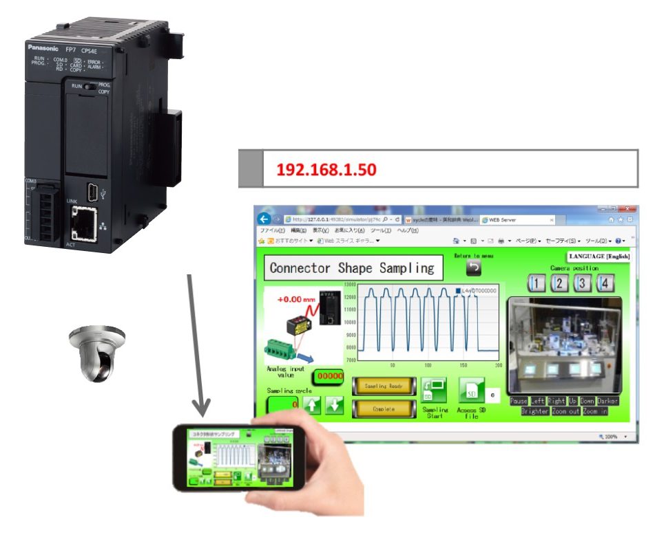 Installando una IP camera su macchine o impianti le immagini possono essere viste in “real time” da qualsiasi postazione PC remota anche da dispositivi mobile (smartphone, tablet) utilizzando un comune Browser Web. È possibile quindi sorvegliare il processo produttivo e fornire un immediato supporto agli operatori o manutentori da remoto in caso di problemi. Sono utilizzabili le IP camera di sicurezza Panasonic (comunicazione con protocollo httphttps).