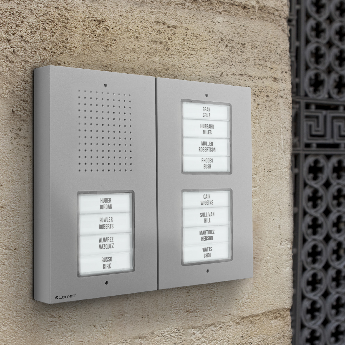 La compattezza di Ciao la rende estremamente versatile grazie alla possibilità di combinare fino a 9 pulsantiere orizzontalmente o verticalmente per un massimo di 72 utenti, con tecnologia 2 fili digitale.