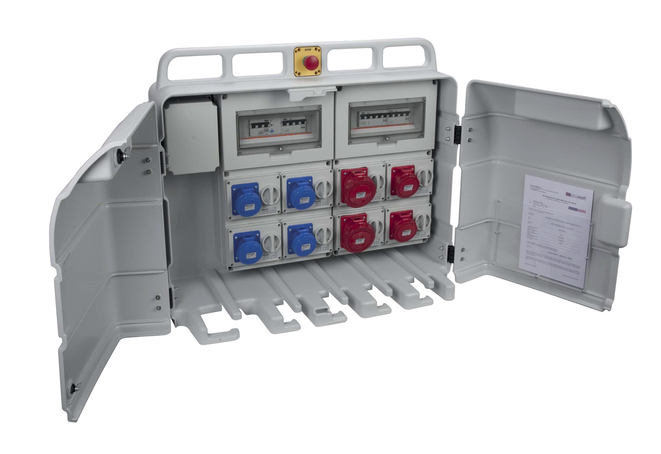 L’alimentazione è con cavo in morsettiera protetta o con spina fissa da 32, 63 o 125 A. Inoltre possono essere cablati e certificati su schema ed esigenze del cliente, senza costi aggiuntivi. Hanno sistema di fermacavi integrato e maniglia di trasporto con comando di distacco di emergenza generale; inoltre, poggiando la base su una superficie piana, permettono di distaccare i cavi d’uscita anche a porte chiuse; e possono essere fissati a parete con staffe o su cavalletto metallico.