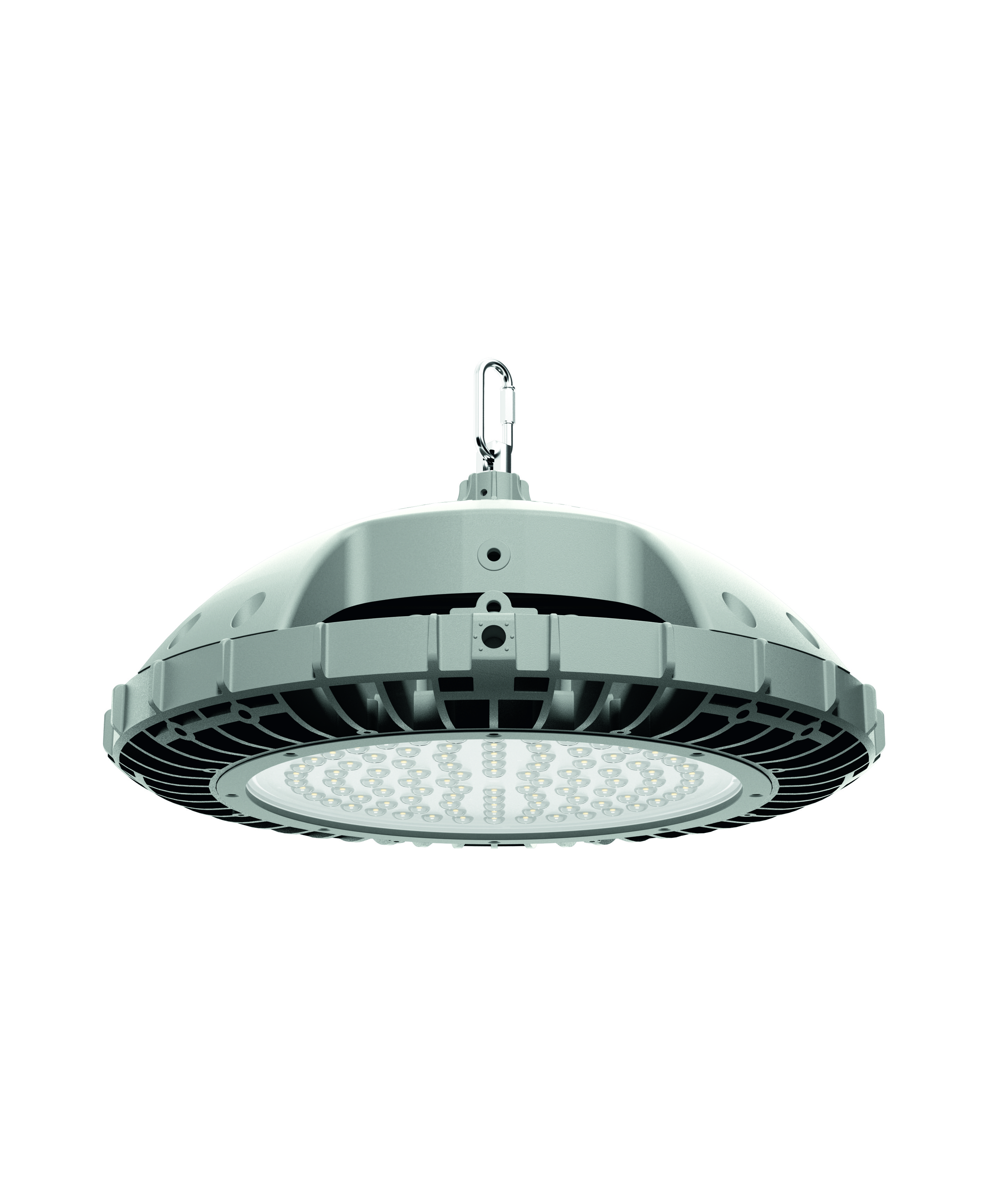 Per quanto riguarda l’installazione, è estremamente pratico e semplice, ed è caratterizzato da un punto unico di montaggio con accessori plug & play, grazie alla dotazione del cavo preassemblato. Può essere sospeso a una catena o montato in appoggio al soffitto tramite le apposite staffe ed è adatto ad aree di applicazione industriali e commerciali, locali di servizio e zone di passaggio, anche in caso di altezze di installazione da 6 a 15 metri.