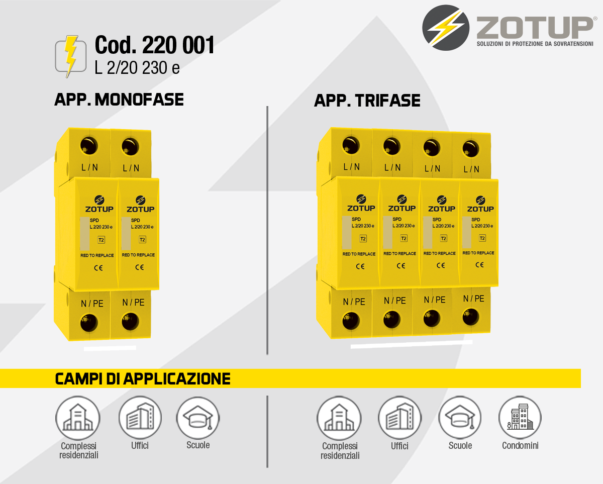Il codice ZOTUP 220 001 è un SPD tipo L 2/20 230 e, monofase. In 20 kA, Uc 335 V ac.
