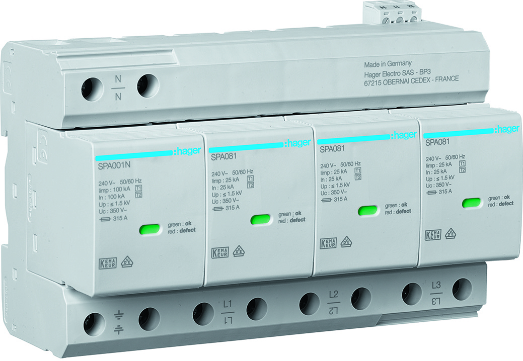Per garantire la sicurezza di impianti, ambienti e persone, Hager Bocchiotti mette a disposizione i nuovi Scaricatori di Sovratensione SPD, selezionabili e combinabili in base alle esigenze e al sistema di rete dell’utenza. La gamma di dispositivi SPD Hager Bocchiotti comprende scaricatori combinati di Tipo 1 + Tipo 2, che utilizzano un’avanzata tecnologia a spinterometro e si applicano all’alimentazione dell’impianto elettrico; scaricatori di Tipo 2 per i quadri di distribuzione secondari e, infine, scaricatori di Tipo 3 per la protezione dei dispositivi terminali.