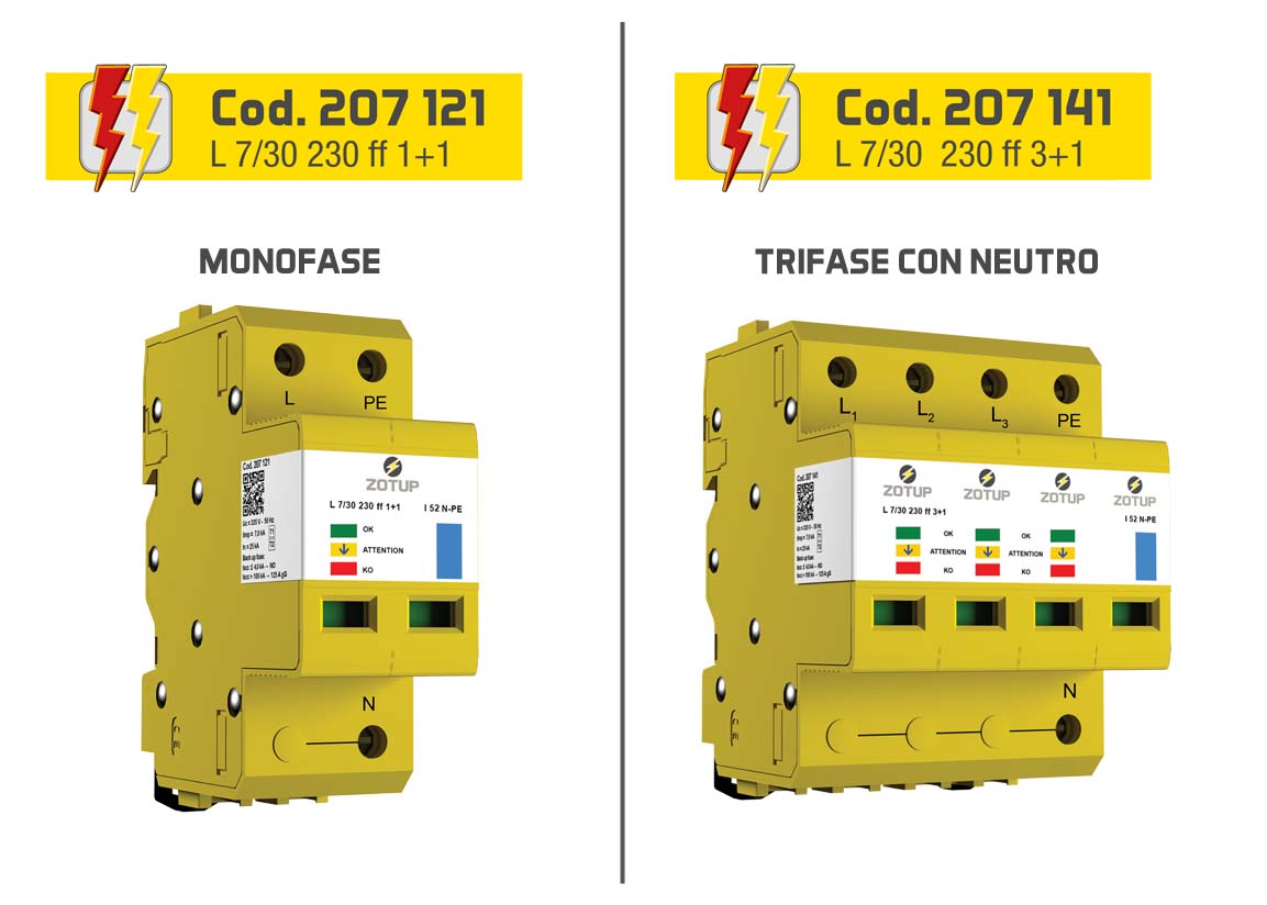 Ø Cod. 207 141: tipo L 7/30 230 ff 3+1, tetrapolare, assemblato con SPD a limitazione e a commutazione, fornisce quattro modi di protezione. Tipicamente installato in circuiti trifase con neutro a 230/400 V in sistemi TT dove è richiesta la connessione tipo CT2 (3+1)