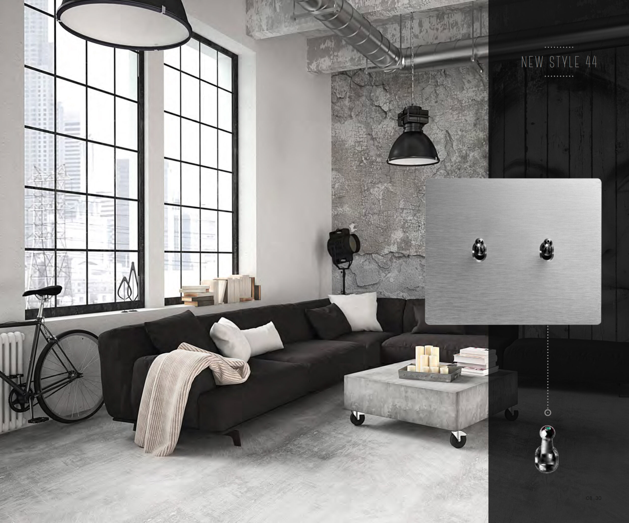 New Style 44 (in foto) ha comandi a levetta e ghiera color cromo che si inseriscono su placche in vetro, bianco e nero, o in alluminio spazzolato naturale e antracite; la versione New Style 44 Corian si contraddistingue invece per le placche in Corian bianco luminoso e comandi a levetta dalle geometrie semplici; mentre England Style 44 ha levette in vero ottone innestate sulle superfici in legno di noce, la serie è completa di placche con finestra per inserimento dei frutti.