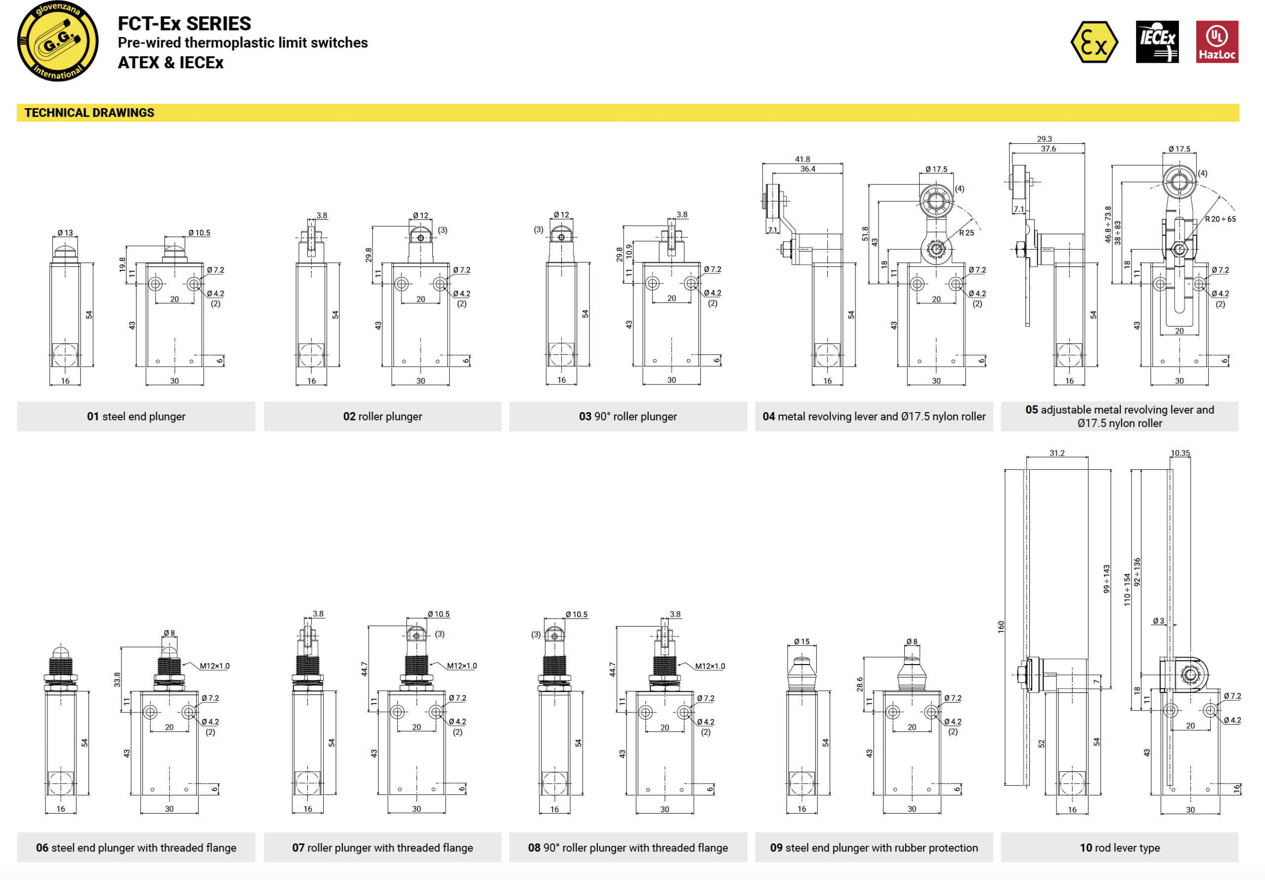 I nuovi finecorsa pre-cablati di Giovenzana della serie FCT-Ex sono appunto un’evoluzione della nostra offerta di finecorsa specificamente riprogettati, soprattutto nella scelta dei materiali, per l’utilizzo in aree pericolose e a rischio d’esplosione.