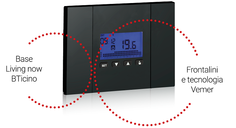 Per questo comprende una vasta gamma di prodotti Vemer a due e tre moduli, che vanno dai cronotermostati alle lampade di emergenza, integrabili nella linea Living Now di BTicino.