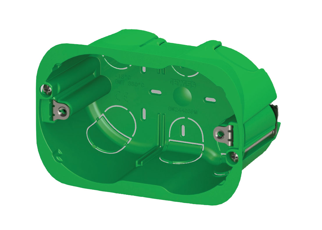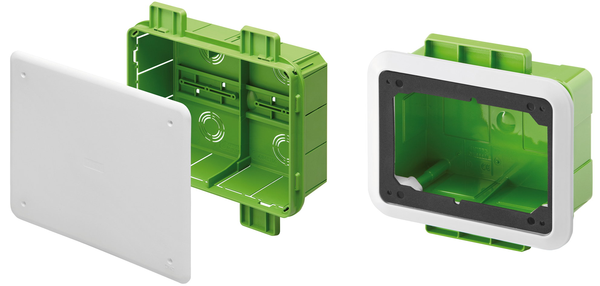 Le scatole rettangolari Green Wall rappresentano la soluzione per l’installazione di serie civili e domotiche. La gamma è composta da scatole rettangolari per serie modulari da 2, 2+2, tre, quattro sei e otto posti e da scatole dedicate a pannelli di comando e touch screen.