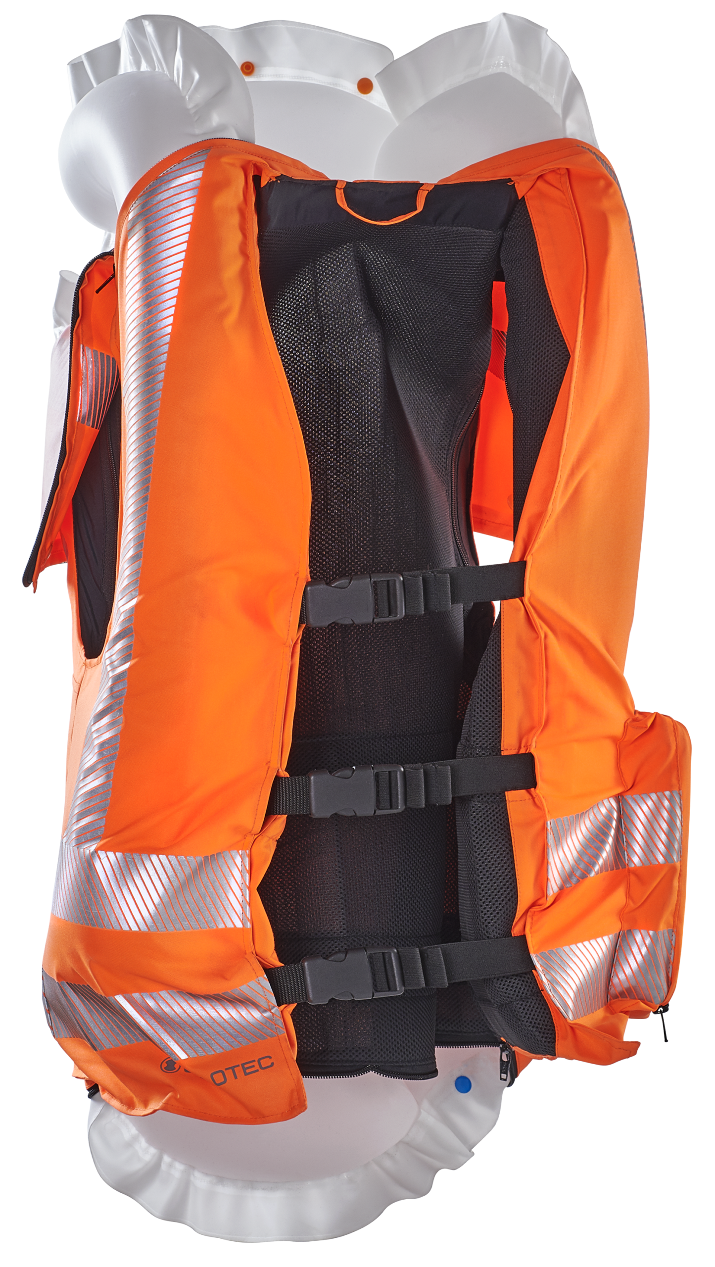 Con una probabilità del 95%, in caso di caduta, non si verificheranno lesioni irreversibili. Una cartuccia di gas riciclabile è inserita nel gilet, che fa scattare l’airbag in caso di emergenza. Può inoltre essere attivato e disattivato premendo un pulsante. Un controllo automatico del sistema mostra tramite una spia LED rossa o verde se l’attivazione è completa. In questo modo è possibile ridurre al minimo il rischio di un’errata applicazione.