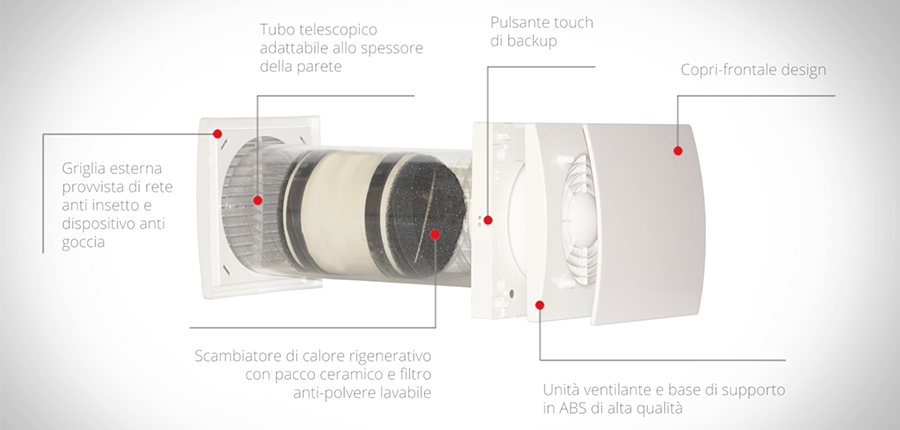 Per garantire la massima flessibilità di utilizzo è prevista la possibilità di modulare in modo automatico la durata del tempo di inversione del flusso – per cui non si ha più la durata fissa di 70 secondi in immissione e 70 secondi in estrazione – ma, grazie ad una sonda di temperatura a bordo dell’unità ventilante, si può settare una modulazione che va da 120 secondi fino ad un minimo di 40 secondi. L’unità ventilante è inoltre dotata di un controllo integrato dell’umidità, nonché di una protezione antigelo, che permette di evitare la formazione di ghiaccio sul pacco scambiatore nei mesi più freddi.
