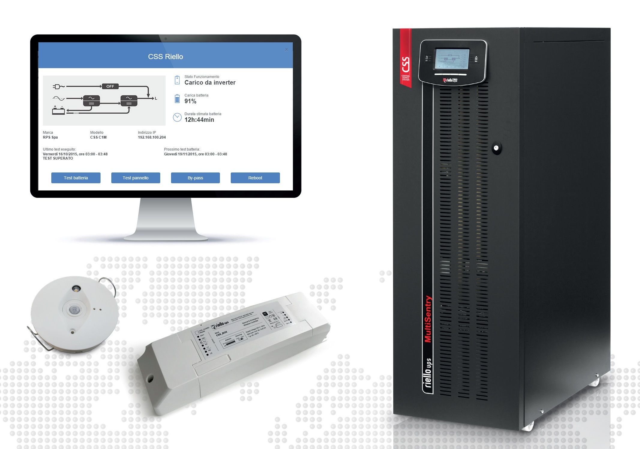 CSS_VISION è il sistema intelligente di Riello UPS per il controllo centralizzato dell’illuminazione ordinaria e di emergenza che permette di monitorare i consumi energetici, controllare ogni tipo di apparecchio d’illuminazione cablato o wireless e individuare in modo semplice ed immediato le anomalie e i guasti dell’impianto.