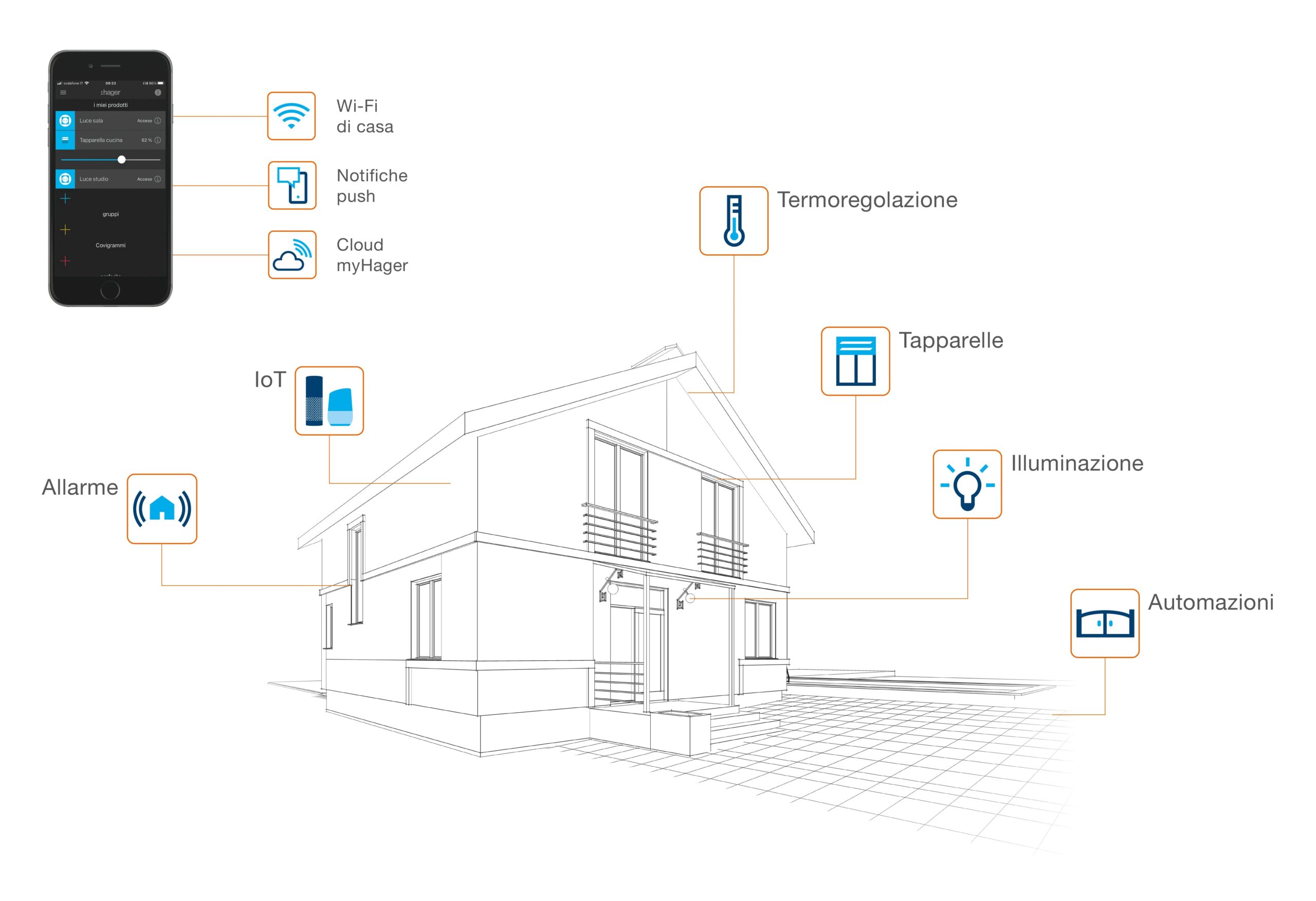 La app coviva permette anche di integrare nell’impianto tebis.quicklink diversi dispositivi IoT come gli assistenti vocali Echo di Amazon e Google home oppure i cronotermostati smart TaDo e le stazioni meteo Netatmo. Tutti i moduli di tebis.quicklink sono prodotti KNX e pertanto possono essere programmati anche tramite il software ETS oppure anche in modalità easy, attraverso il server domovea incluso nella valigia di configurazione TXA101 e accessibile tramite la app Hager Pilot.