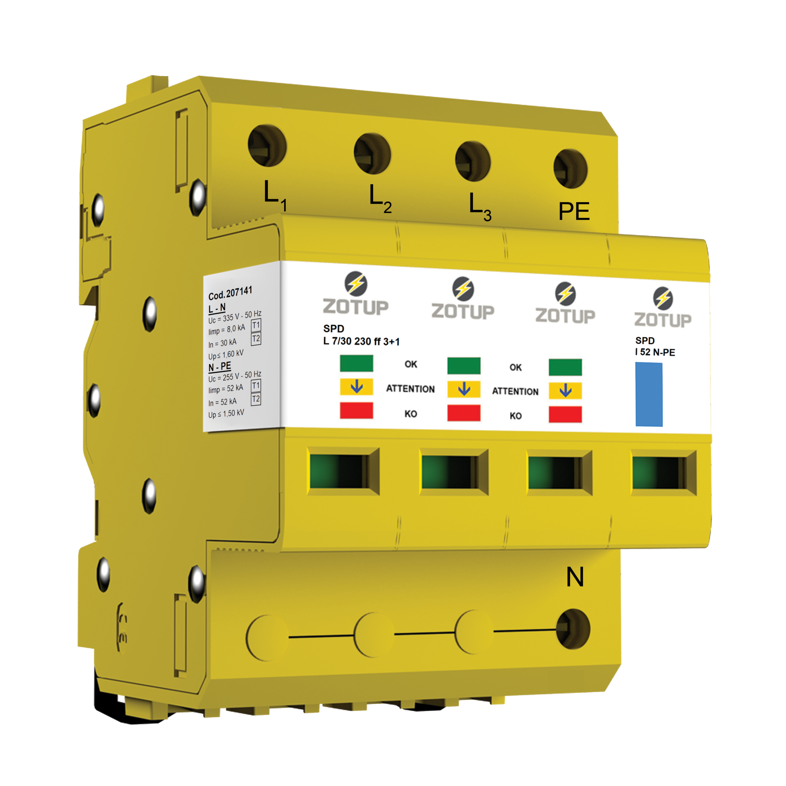 ZOTUPLIMITER L 7/30 230 3+1 cod. 207 141. SPD tetrapolare tipicamente installato in circuiti trifase con neutro a 230/400 V.