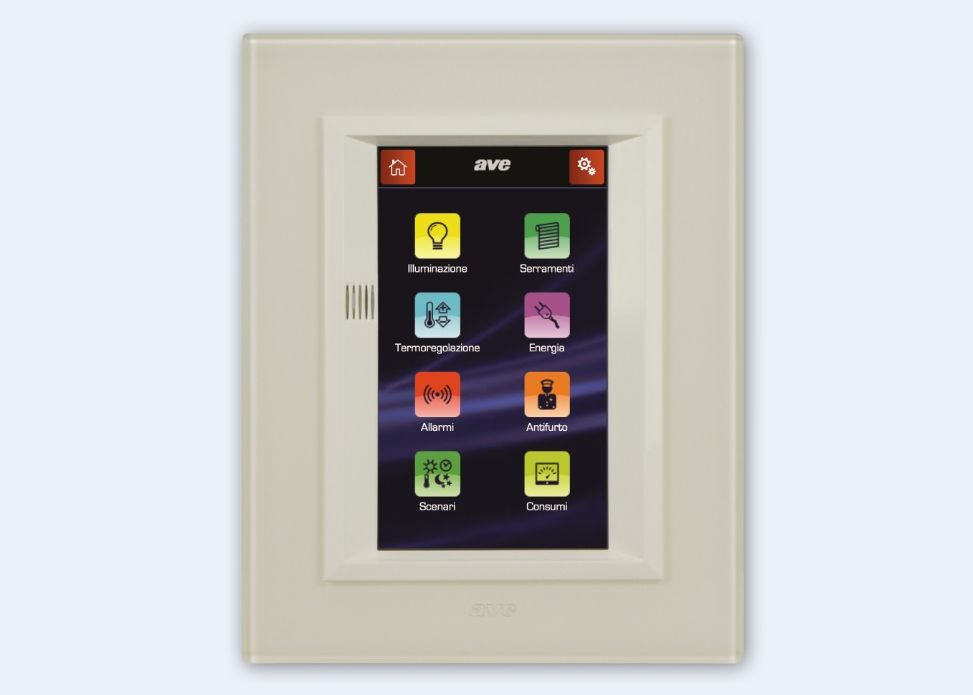 supervisore domotico AveTecnologico ma mini, tanto da potere essere adattato a qualsiasi spazio e orientabile in orizzontale o verticale. È il nuovo supervisore domotico da 4,3” mini touch screen TS01 che integra le funzioni del sistema Domina plus di Ave in uno spazio contenuto.