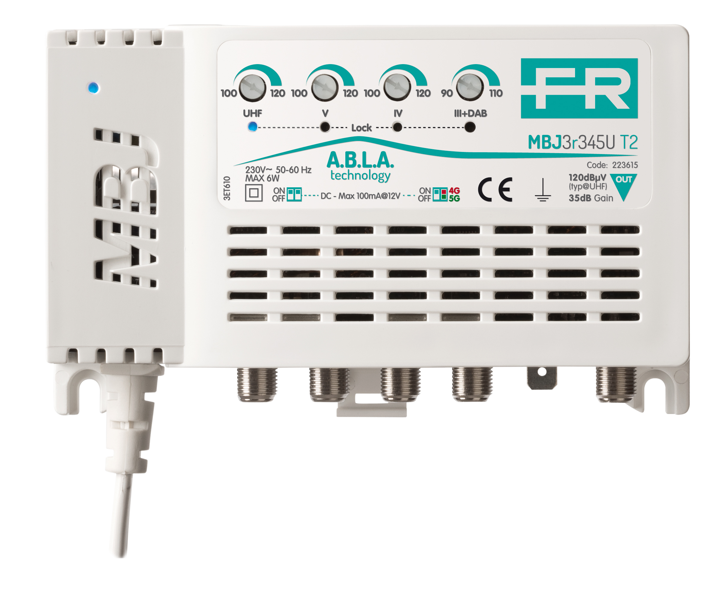La nuova gamma comprende anche i centralini multingresso alimentati da interno MBJ EVO T2, con livello di uscita fino a 120dBµV in banda UHF e regolazioni del livello di uscita indipendenti e stabilizzate per ogni ingresso. Anche in questo caso la presenza di filtri LTE 4G e 5G integrati risulta molto vantaggiosa dal punto di vista dell’ingombro nelle cassette di derivazione rispetto all’impiego di un eventuale filtro esterno.