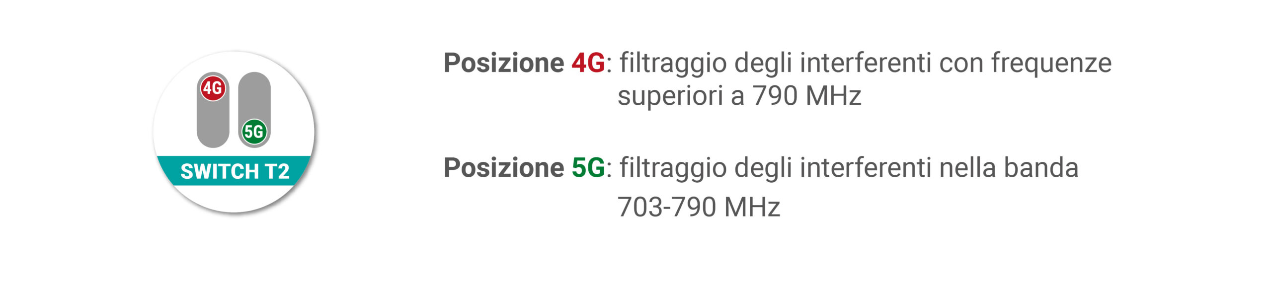 Gli amplificatori da palo e da interno serie T2 sono dotati di uno switch 4G/5G che consente la selezione del filtraggio in base alle eventuali interferenze causate dai ripetitori telefonici; questa condizione può rendersi necessaria quando tra il sistema d’antenna e la stazione di trasmissione è presente un emittente per i servizi mobile: la posizione 4G va utilizzata in presenza di interferenti a frequenze superiori a 790 MHz, mentre la posizione 5G sarà utile con interferenze nella banda 703-790 MHz.