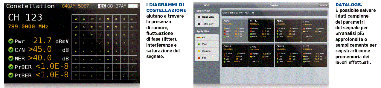 Indispensabili per capire la qualità dei segnali digitali: i diagrammi di costellazione aiutano a trovare la presenza di rumore, fluttuazione di fase (jitter), interferenze e saturazione del segnale. Permette di visualizzare gli echi del segnale ricevuto, consentendo all’installatore di minimizzarli per quanto possibile in modo da ottenere una ricezione ottimale del segnale.