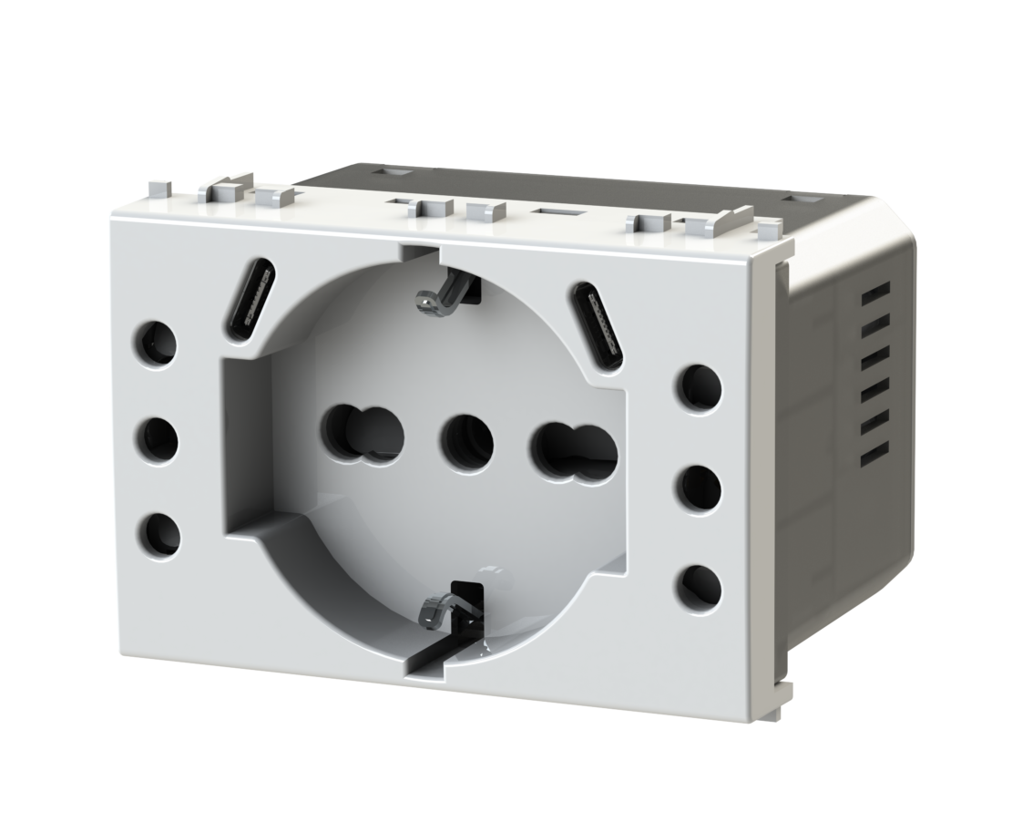 USBP503 è la prima stazione di alimentazione e ricarica da incasso, dotata sia di prese tradizionali sia di un alimentatore USB da 3A-15W con 2 connettori di tipo C