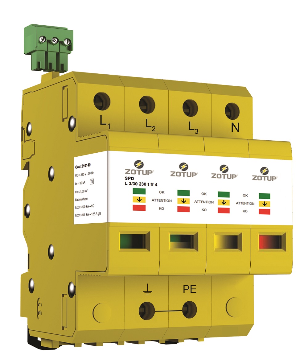 Il 210 140 anch’esso tetrapolare, sempre assemblato con quattro SPD a limitazione per circuiti trifase con neutro a 230/400 V in sistemi TN-S, viene invece installato in quadri di distribuzione secondaria (SQBT).