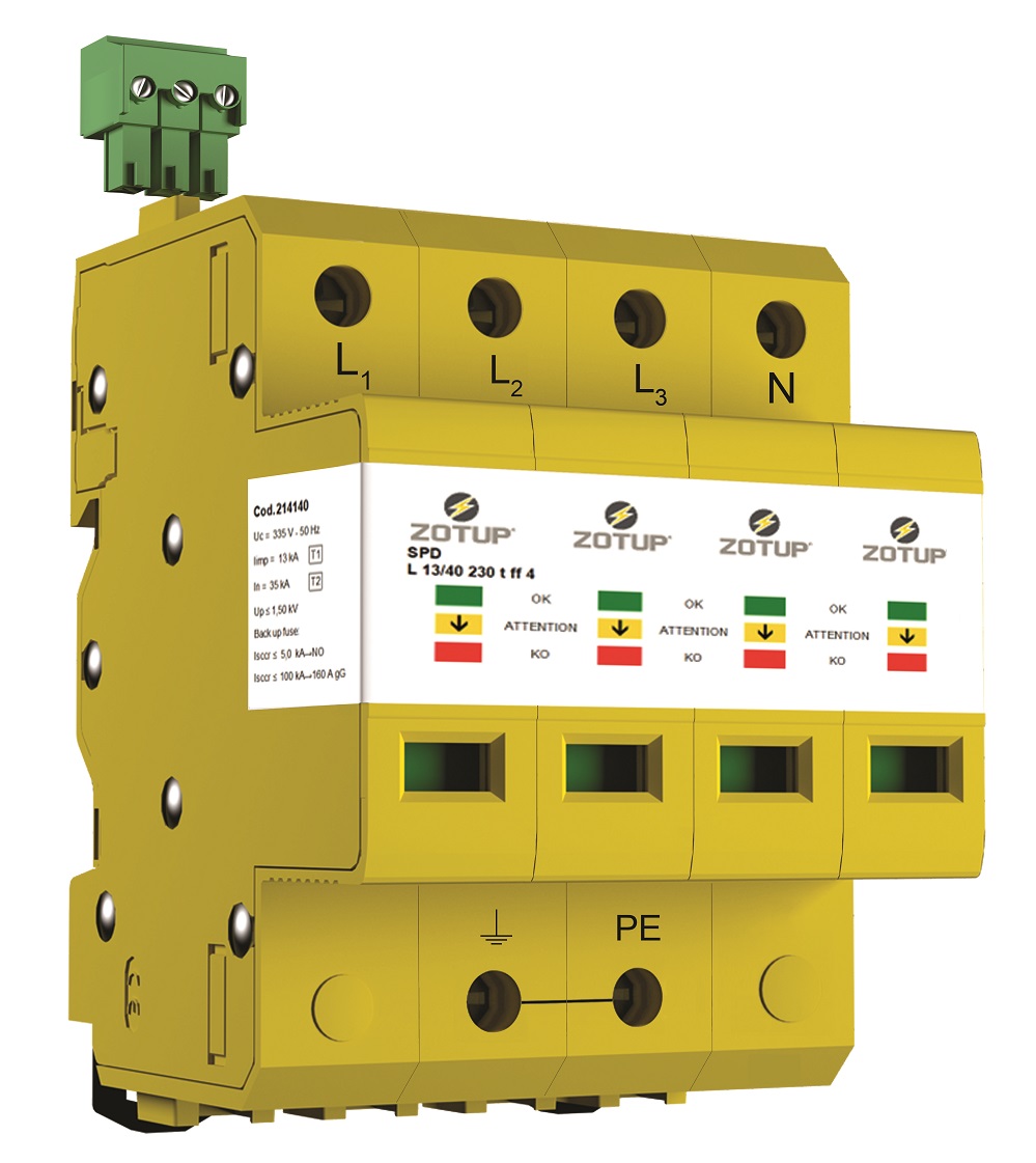 Nel dettaglio, il 214 140, è uno scaricatore di sovratensioni tetrapolare assemblato con quattro SPD a limitazione pronto per l’installazione, destinato all’inserimento in quadri principali (QGBT) all’origine dell’impianto BT di circuiti trifase con neutro a 230/400 V, per sistemi TN-S.