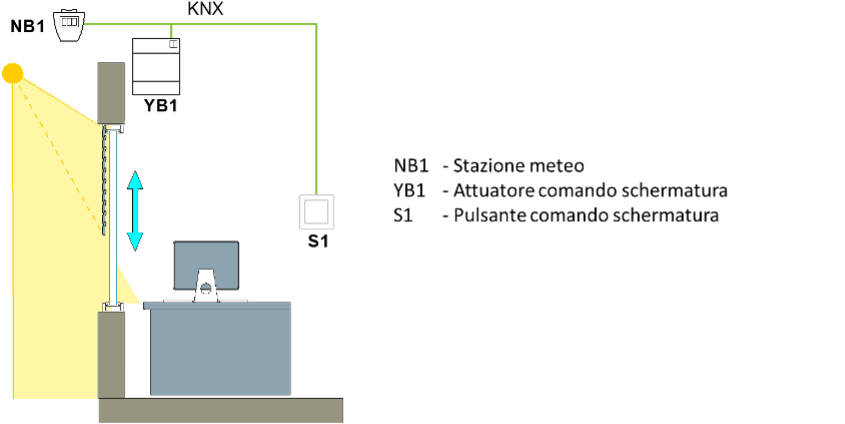 Sulla stazione meteo risiede l’algoritmo di elaborazione di tutti i dati raccolti dai differenti sensori ai fini del controllo della schermatura solare. La posizione del sole (altezza e azimut) viene determinata sulla base della data e dell’ora del giorno e delle coordinate locali, dati trasmessi via bus alla stazione meteo. Questa soluzione ha come obiettivo primario quello di evitare il verificarsi di fenomeni di abbagliamento in ambiente. In questo caso, la classe di prestazione energetica offerta dalla soluzione è la classe B.