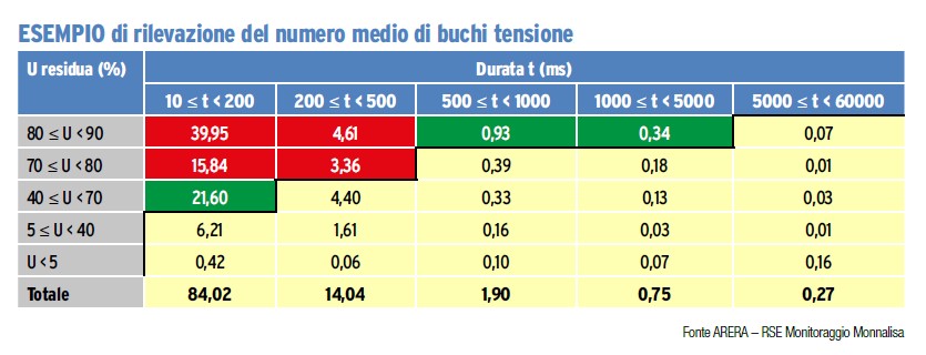 Le batterie dell’UPS possono essere dimensionate per superare interruzioni di qualche minuto; per interruzioni più lunghe serve anche il gruppo elettrogeno. Sempre nella tabella è riportato porta un esempio di sintesi dei buchi di tensione desunto dal sistema di monitoraggio della qualità della tensione. L’evoluzione regolatoria è orientata nella direzione di limitare i buchi di tensione della zona gialla dal momento che gli apparecchi di classe 3 ne risentono. Quest’ultima classe di apparati elettrici è prevista per ambienti di installazione dove la maggior parte del carico è alimentata tramite convertitori; macchine saldatrici, motori di grossa potenza vengono avviati frequentemente e i carichi variano rapidamente.