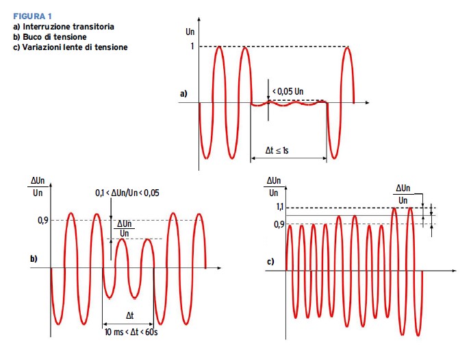 Quando per una durata ≤ 1s la tensione d’alimentazione scende sotto il valore del 5% della tensione dichiarata (Un) si parla d’interruzione transitoria. Il buco di tensione è invece convenzionalmente definito come una diminuzione improvvisa della tensione di alimentazione a un valore compreso tra il 90 e il 5% di Un, seguita da un ripristino dopo un breve periodo di tempo compreso tra 10 ms e 1 minuto (figura 1b).