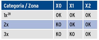 Si tratta di un argomento un poco più complesso del solito, ma proviamo a metterlo in buon ordine. La categoria della costruzione è legata al numero di guasti che portano all’innesco e deve essere scelta in modo da scongiurare il verificarsi dell’esplosione fino al verificarsi di 3 eventi sfavorevoli contemporaneamente. Le categorie adatte a ciascuna zona e la zona stessa sono quelle indicate in tabella (scrivo X per riferirmi contemporaneamente a gas e polveri).